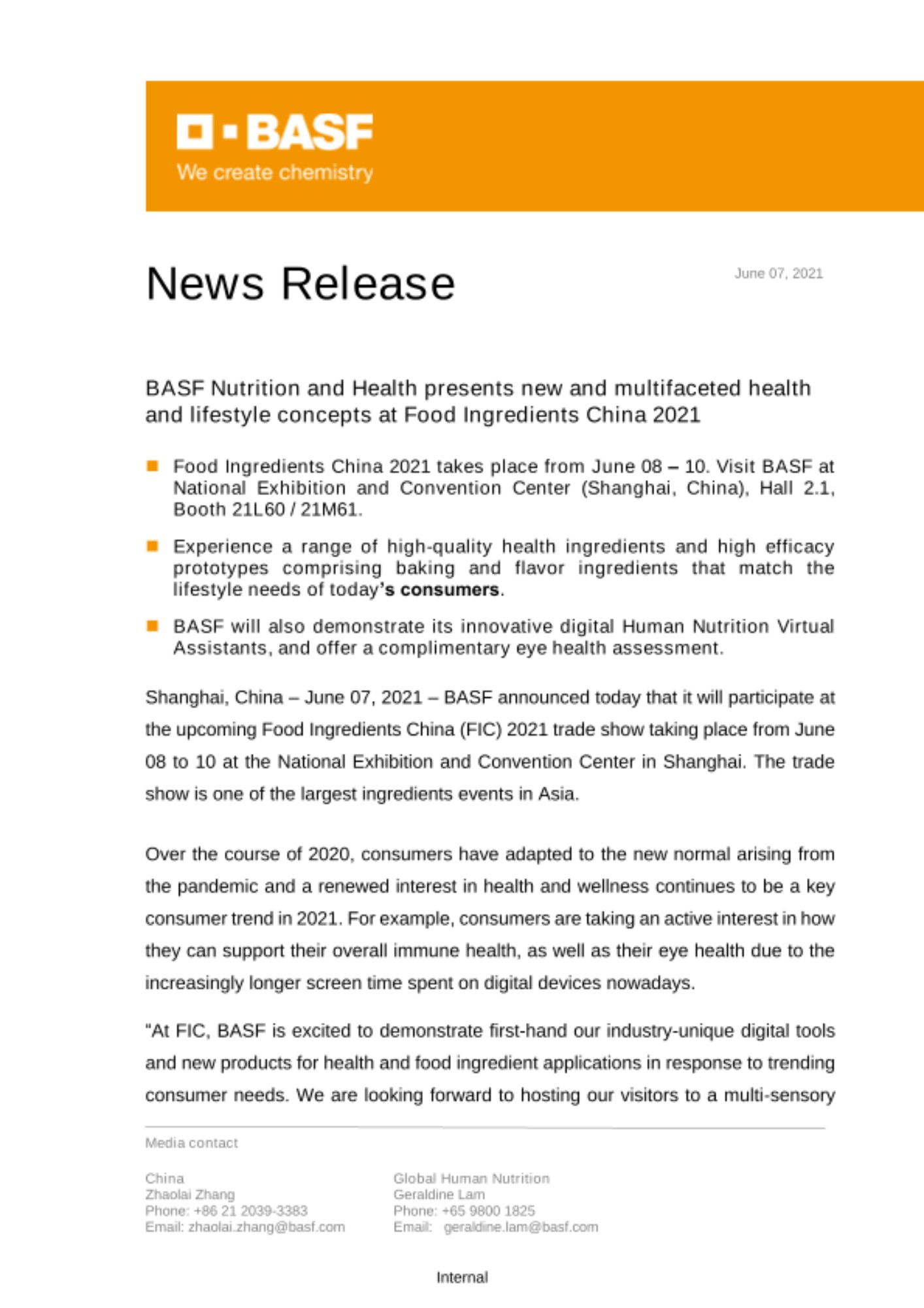 Shanghai, China – June 07, 2021 – BASF announced today that it will participate at the upcoming Food Ingredients China (FIC) 2021 trade show taking place from June 08 to 10 at the National Exhibition and Convention Center in Shanghai. The trade show is one of the largest ingredients events in Asia.