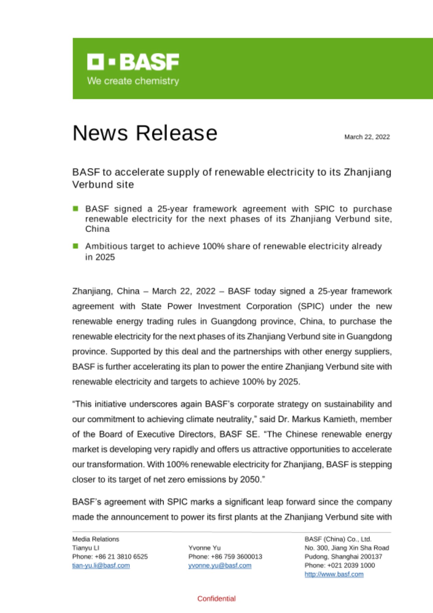 - BASF signed a 25-year framework agreement with SPIC to purchase renewable electricity for the next phases of its Zhanjiang Verbund site, China