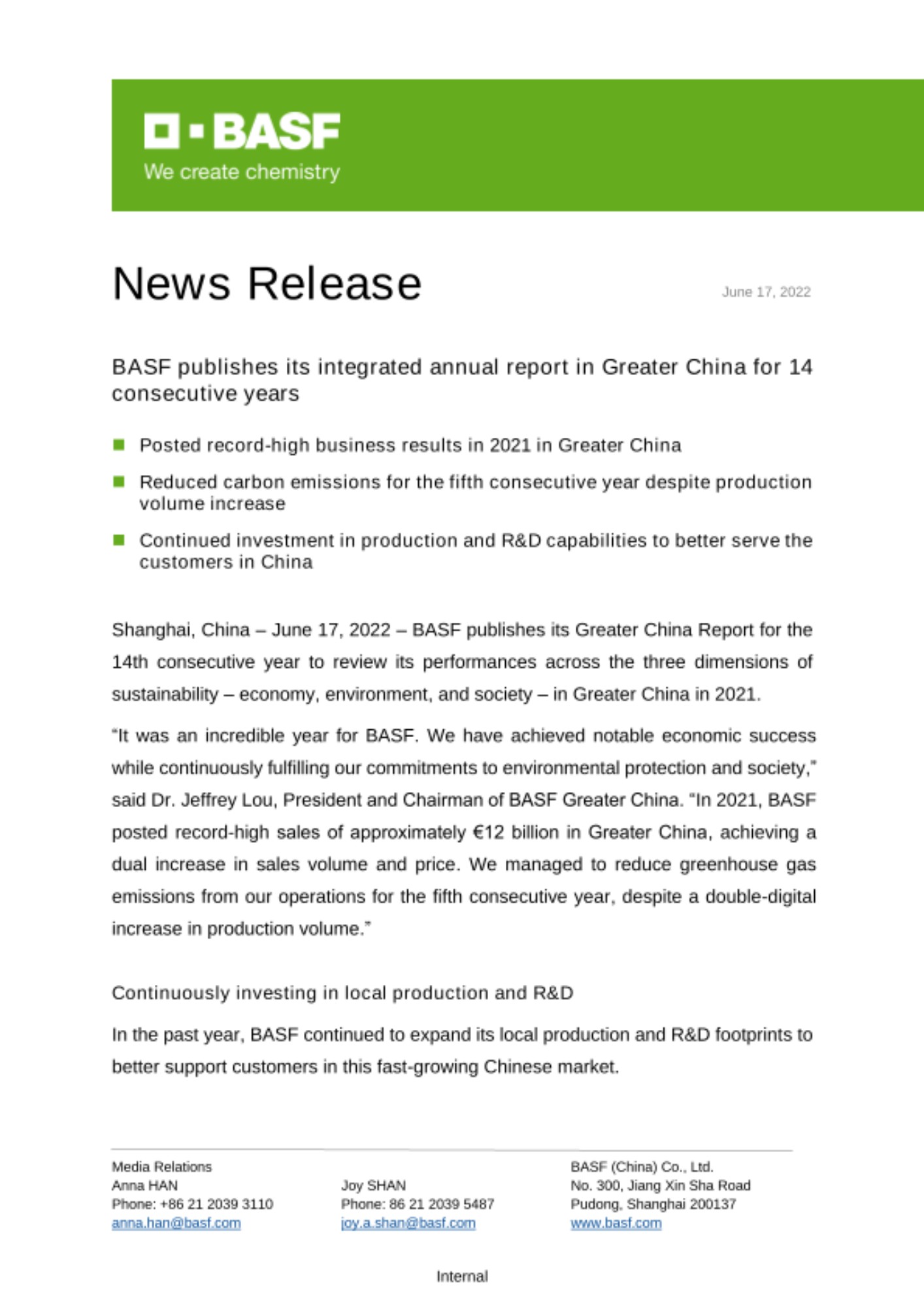 “It was an incredible year for BASF. We have achieved notable economic success while continuously fulfilling our commitments to environmental protection and society,” said Dr. Jeffrey Lou, President and Chairman of BASF Greater China. “ In 2021, BASF posted record-high sales of approximately €12 billion in Greater China, achieving a dual increase in sales volume and price. We managed to reduce greenhouse gas emissions from our operations for the fifth consecutive year, despite a double-digital increase in production volume.”