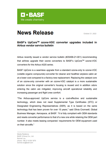 BASF’s UpCoreTM ozone-VOC converter upgrades included in Airbus vendor service bulletin
