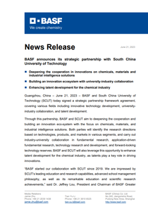 Zhang Liqun, President of South China University of Technology commented: “BASF’s expertise in material and chemicals is a perfect match with SCUT’s strength, which is also one of our focuses to support and develop. With this partnership, we can drive synergy to lead the market-oriented research and in-depth exploration. Our collective efforts will also contribute to original, disruptive, and impactful research results, as well as foster more innovative talents, in order empower the development of the region.”