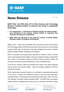 Qi Xin, Director of Exhibition and Education Center of CSTM, stated, "For more than two decades, BASF Kids' Lab has been a popular science education program among children and their parents. We will join hands with BASF in this summer to continuously promote science education among children through hands-on experiments that are close to current social issues and cultivate a spirit of inquiry-based learning. We look forward to further collaboration with BASF in future to carry out more innovative science education activities."