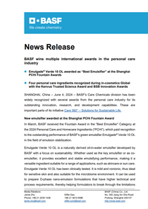 SHANGHAI, China – June 4, 2024 – BASF's Care Chemicals division has been widely recognized with several awards from the personal care industry for its outstanding innovation, research, and development capabilities. These are important parts of its initiativeCare 360° – Solutions for Sustainable Life.