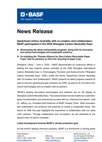 Shanghai, China – June 5, 2024 – BASF demonstrates its continuous efforts in leading the way towards carbon neutrality at the 2024 Shanghai International Carbon Neutrality Expo in Technologies, Products and Achievements (“Shanghai Carbon Neutrality Expo”, CNE). Under the theme "Spearhead Carbon Neutrality with Co-creation and Collaboration", BASF presents its latest progress towards its goal of net-zero greenhouse gas emissions by 2050, as well as its innovative low-carbon technologies and co-creation with its partners.