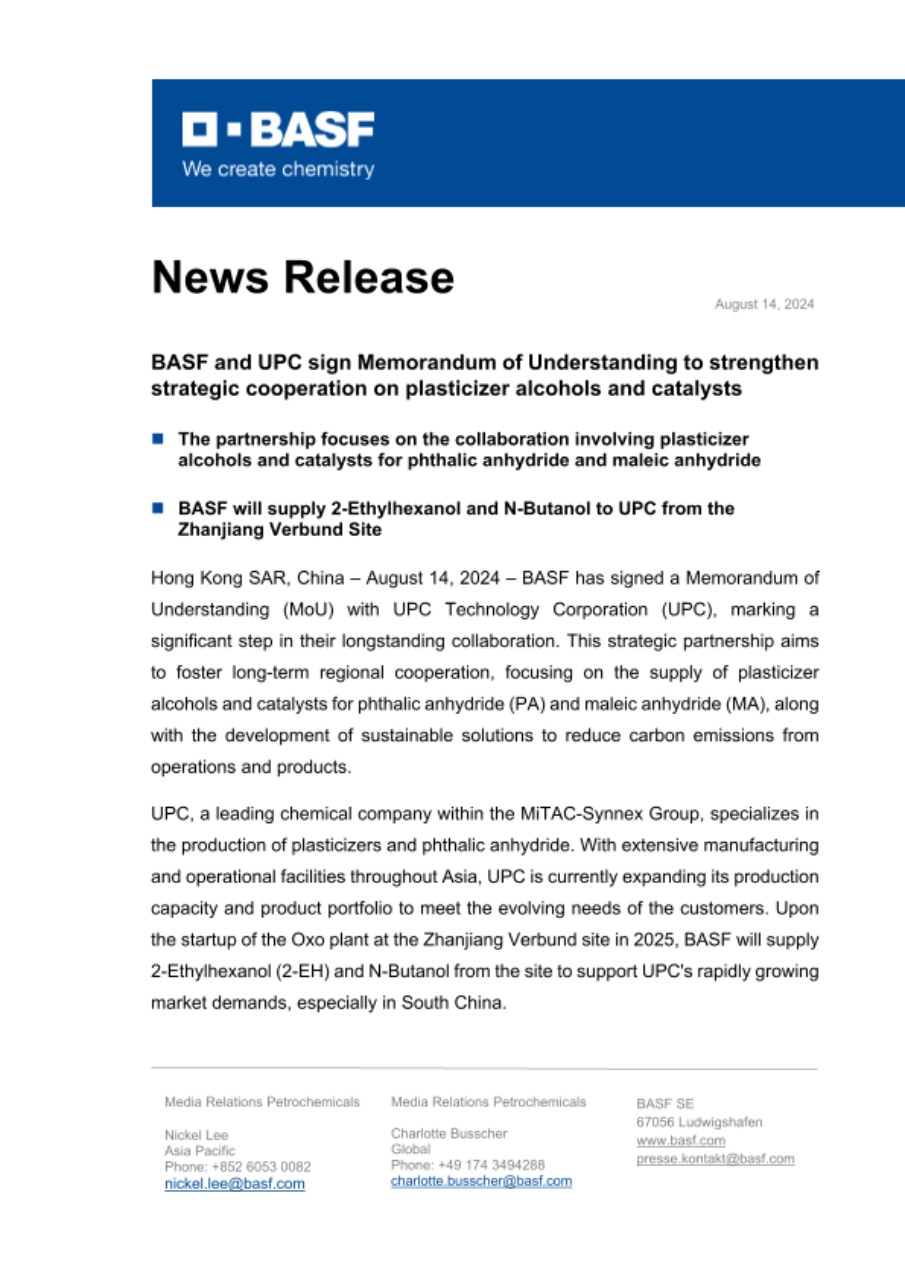 Hong Kong SAR, China – August 14, 2024 – BASF has signed a Memorandum of Understanding (MoU) with UPC Technology Corporation (UPC), marking a significant step in their longstanding collaboration. This strategic partnership aims to foster long-term regional cooperation, focusing on the supply of plasticizer alcohols and catalysts for phthalic anhydride (PA) and maleic anhydride (MA), along with the development of sustainable solutions to reduce carbon emissions from operations and products.