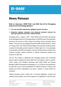 Chongqing, China – August 1, 2024 – Today, BASF kicks off its Kids' Lab program at the Chongqing Science & Technology Museum (CQSTM) as part of its exploration journey for the summer of 2024, aiming at promoting science education among children. This year, two new engaging and safe scientific experiments were , known as "Fantasy Foam" and "Water Absorbent Magic" were launched, enabling children to explore the fascinating world of polymers. Children aged 6 to 12 can participate in this program at CQSTM until August 4, and learn through hands-on activities how scientists leverage material innovation to develop customized solutions that enhance our daily lives.