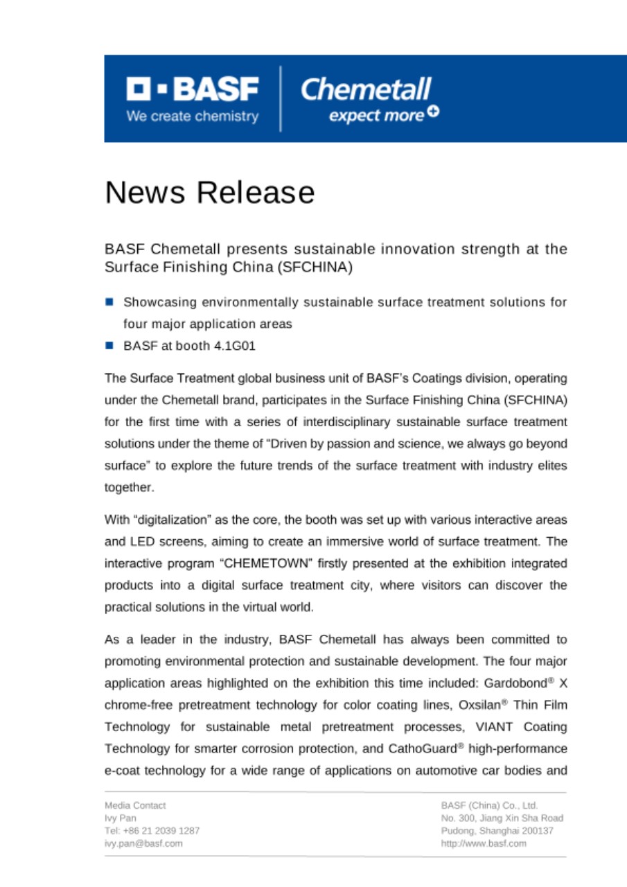 The Surface Treatment global business unit of BASF’s Coatings division, operating under the Chemetall brand, participates in the Surface Finishing China (SFCHINA) for the first time with a series of interdisciplinary sustainable surface treatment solutions under the theme of “Driven by passion and science, we always go beyond surface” to explore the future trends of the surface treatment with industry elites together.
