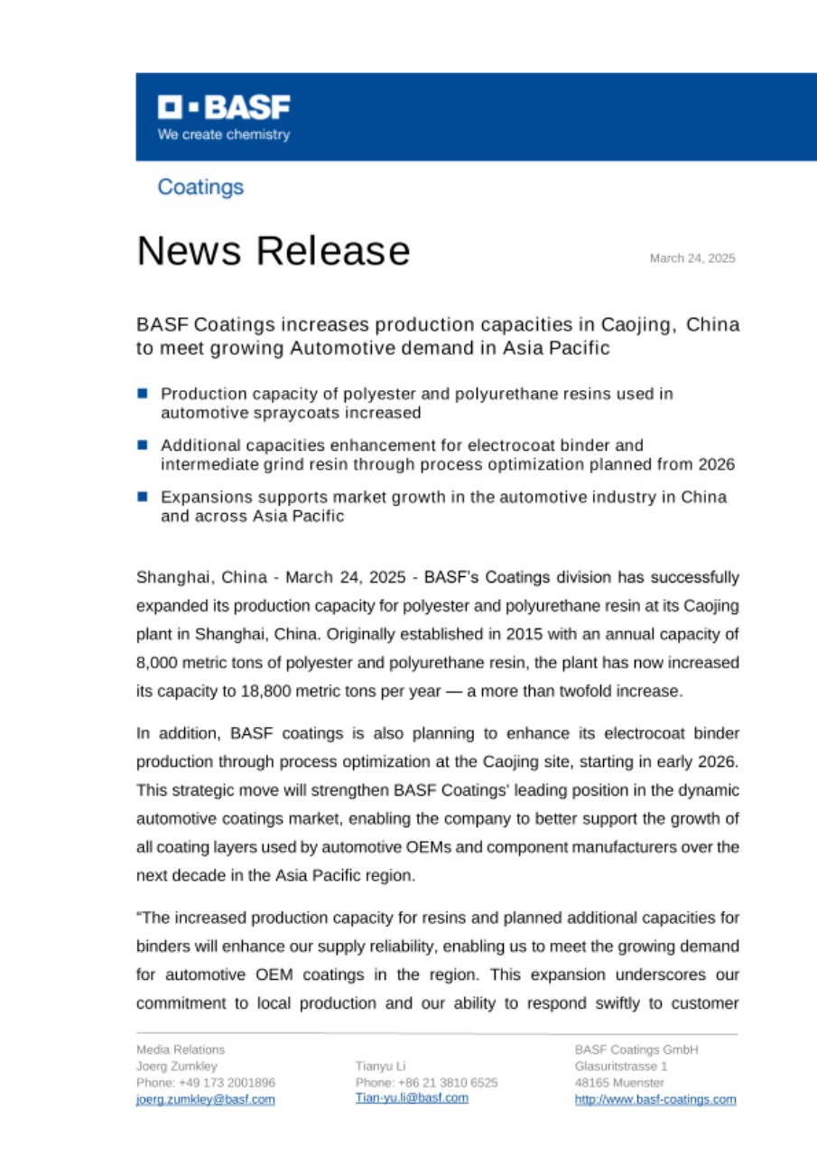 In addition, BASF coatings is also planning to enhance its electrocoat binder production through process optimization at the Caojing site, starting in early 2026. This strategic move will strengthen BASF Coatings' leading position in the dynamic automotive coatings market, enabling the company to better support the growth of all coating layers used by automotive OEMs and component manufacturers over the next decade in the Asia Pacific region.