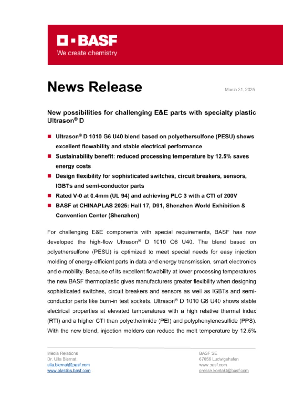 “If you want to develop energy-efficient electronic devices with special demands on electrical and mechanical performance, then our new Ultrason® D is a clever choice”, say Kazuhiro Kida from global business development Ultrason® at BASF. “It benefits from the excellent properties of our established polyethersulfone Ultrason® E while offering optimized E&E performance, outstanding flowability and the sustainable usage of processing energy. This opens up new possibilities for e-mobility and consumer electronics parts. It also contributes to higher safety for applications with increased voltage and data rates under harsh operating conditions.” Ultrason® D 1010 G6 U40 is part of BASF’s tailored Ultrason® portfolio for the E&E industry: These grades enhance the robustness, durability and reliability of today’s and next generation E&E components to advance digitalization, big data and e-mobility. They are especially suited where other plastics fail to meet increased performance requirements.