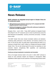 BASF publishes its integrated annual report in Greater China for the 17th consecutive year