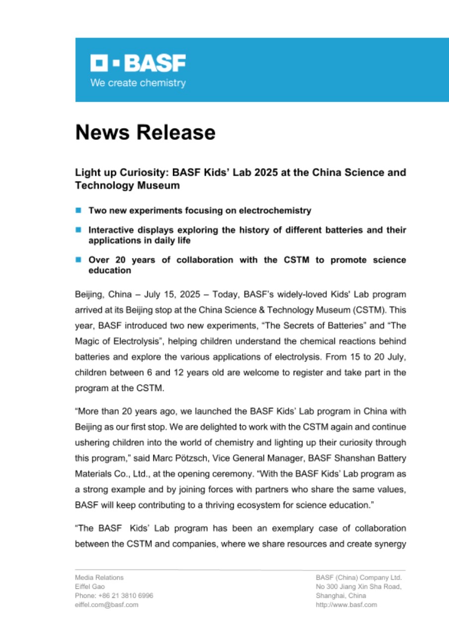 Beijing, China – July 15, 2025 – Today, BASF’s widely-loved Kids' Lab program arrived at its Beijing stop at the China Science & Technology Museum (CSTM). This year, BASF introduced two new experiments, “The Secrets of Batteries” and “The Magic of Electrolysis”, helping children understand the chemical reactions behind batteries and explore the various applications of electrolysis. From 15 to 20 July, children between 6 and 12 years old are welcome to register and take part in the program at the CSTM.
