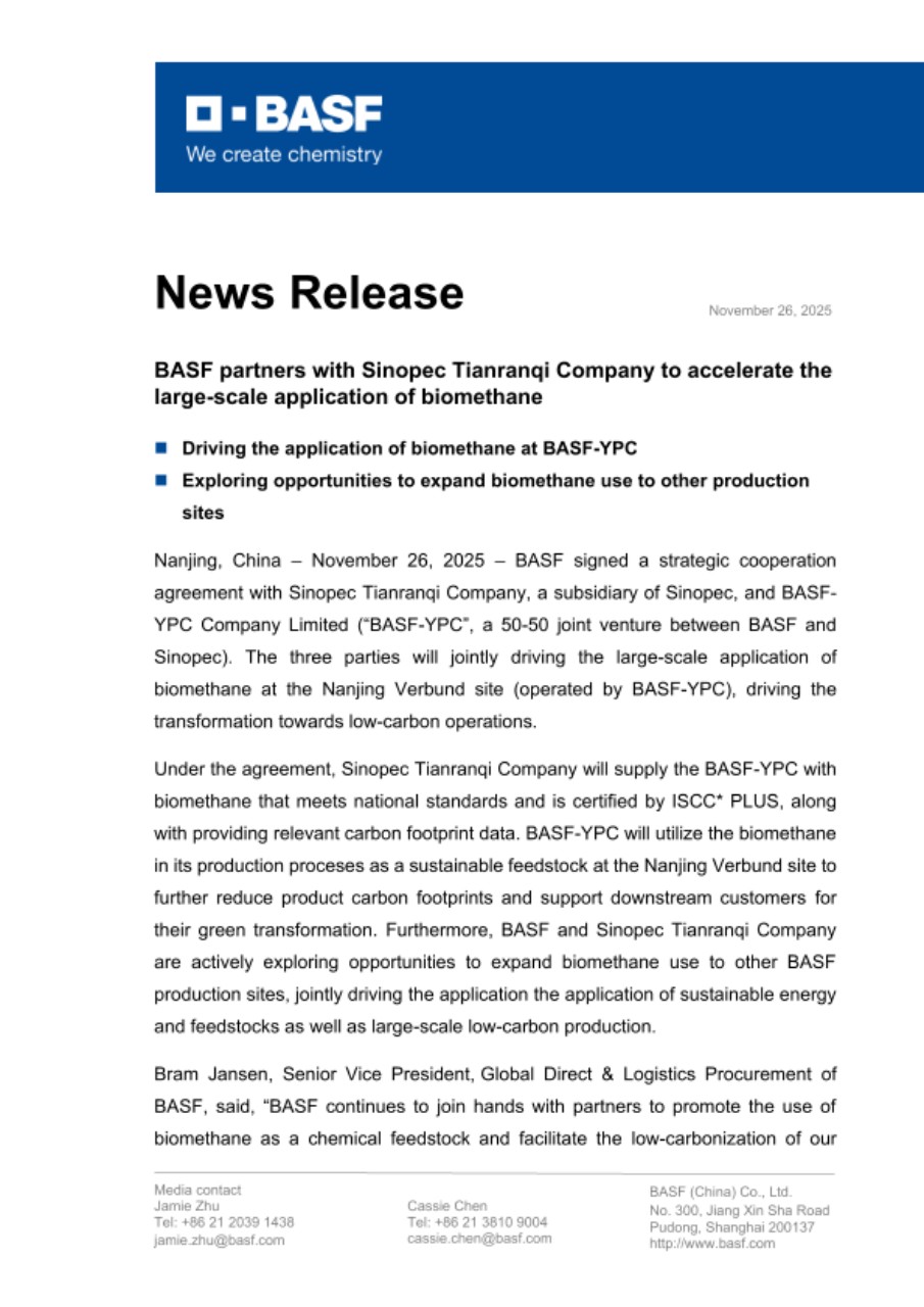Nanjing, China – November 26, 2025 – BASF signed a strategic cooperation agreement with Sinopec Tianranqi Company, a subsidiary of Sinopec, and BASF-YPC Company Limited (“BASF-YPC”, a 50-50 joint venture between BASF and Sinopec). The three parties will jointly driving the large-scale application of biomethane at the Nanjing Verbund site (operated by BASF-YPC), driving the transformation towards low-carbon operations.