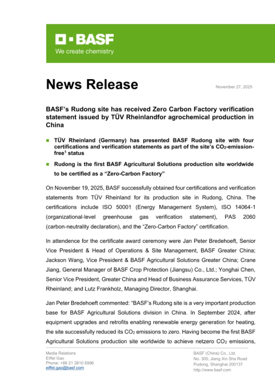 Jan Peter Bredehoeft commented: “BASF’s Rudong site is a very important production base for BASF Agricultural Solutions division in China. In September 2024, after equipment upgrades and retrofits enabling renewable energy generation for heating, the site successfully reduced its CO2 emissions to zero. Having become the first BASF Agricultural Solutions production site worldwide to achieve netzero CO2 emissions, Rudong site then initiated the certification process for a ‘ZeroCarbon Factory.’ Today, we are pleased to witness Rudong’s formal entry into the ranks of certified ZeroCarbon Factories. These certifications and verification statements not only recognize Rudong’s efforts and achievements in energy and resource use, greenhousegas reduction measures, and carbonoffset initiatives but also represent a significant milestone in BASF’s commitment to sustainability in agriculture.”
