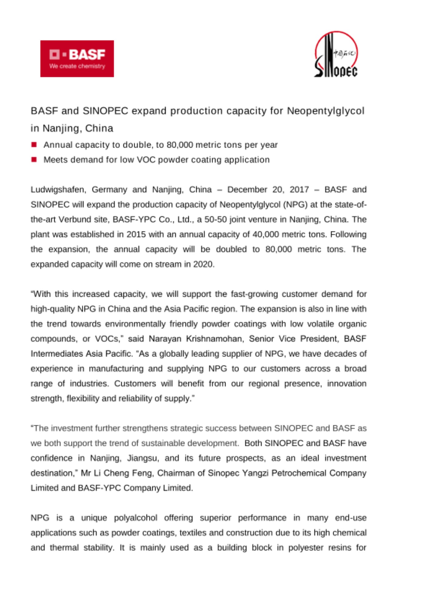 Ludwigshafen, Germany and Nanjing, China – December 20, 2017 – BASF and SINOPEC will expand the production capacity of Neopentylglycol (NPG) at the state-of-the-art Verbund site, BASF-YPC Co., Ltd., a 50-50 joint venture in Nanjing, China. The plant was established in 2015 with an annual capacity of 40,000 metric tons. Following the expansion, the annual capacity will be doubled to 80,000 metric tons. The expanded capacity will come on stream in 2020.