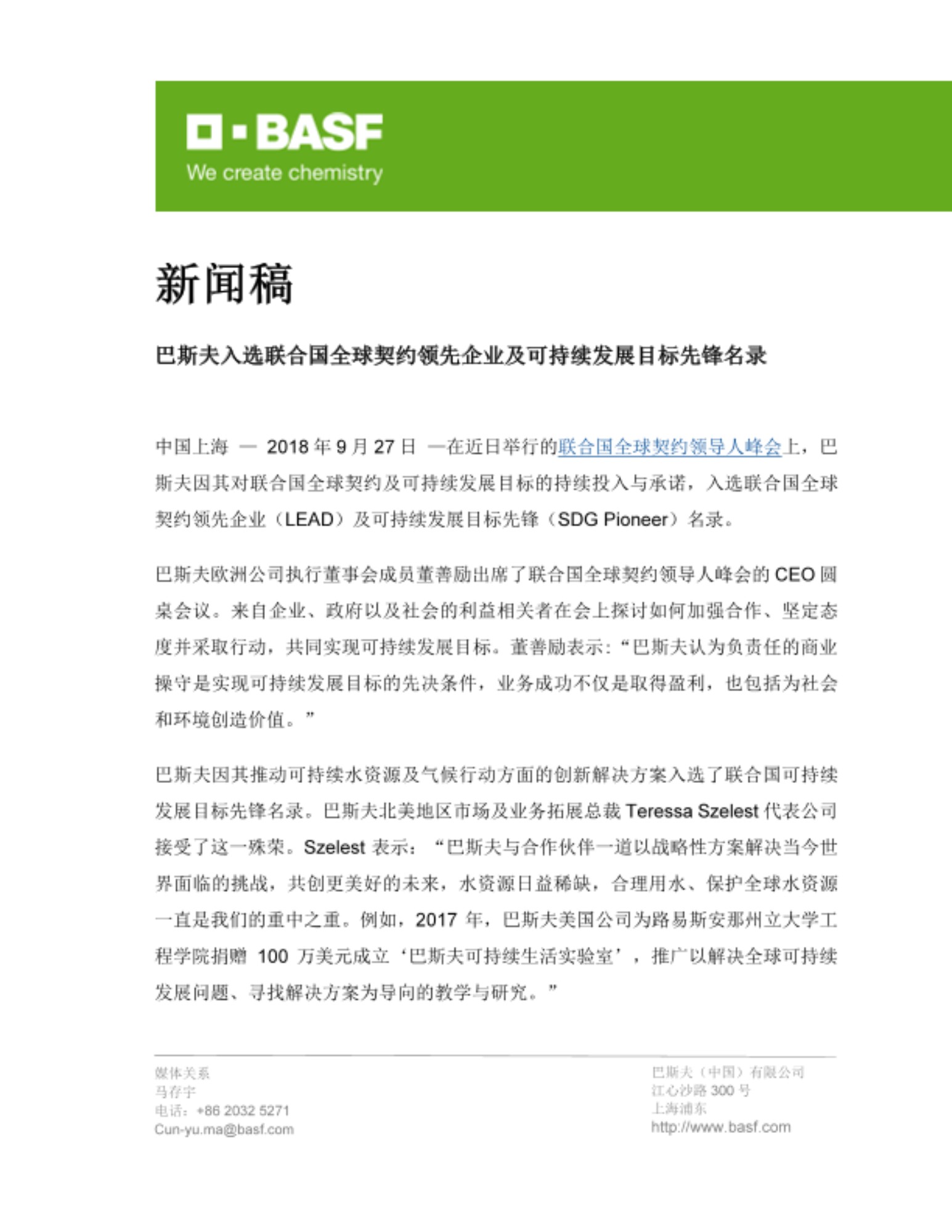 FLORHAM PARK, NJ, September 25, 2018 – BASF was recognized for its continuing involvement and commitment to the United Nations (UN) Global Compact and the Sustainable Development Goals (SDGs) as a UN Global Compact LEAD company and as an SDG Pioneer during the UN Global Compact Leaders Summit.