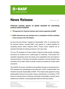 As part of the joint initiative “Together for Sustainability” (TfS), 37 companies from the chemical industry, including BASF, have agreed on a global guideline for calculating product carbon footprints (PCFs). Product carbon footprints are an important information for steering emissions in the value chain.