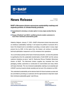 Waterloo, Belgium, January 17, 2023 – BASF’s Monomers division has announced an ambitious sustainability roadmap: It will expand its portfolio of products with a lower CO2 footprint and is committed to providing a circular option in every major product line by 2025. At the same time, the division will continue to prioritize technical optimization measures to cut CO2 emissions from operations.