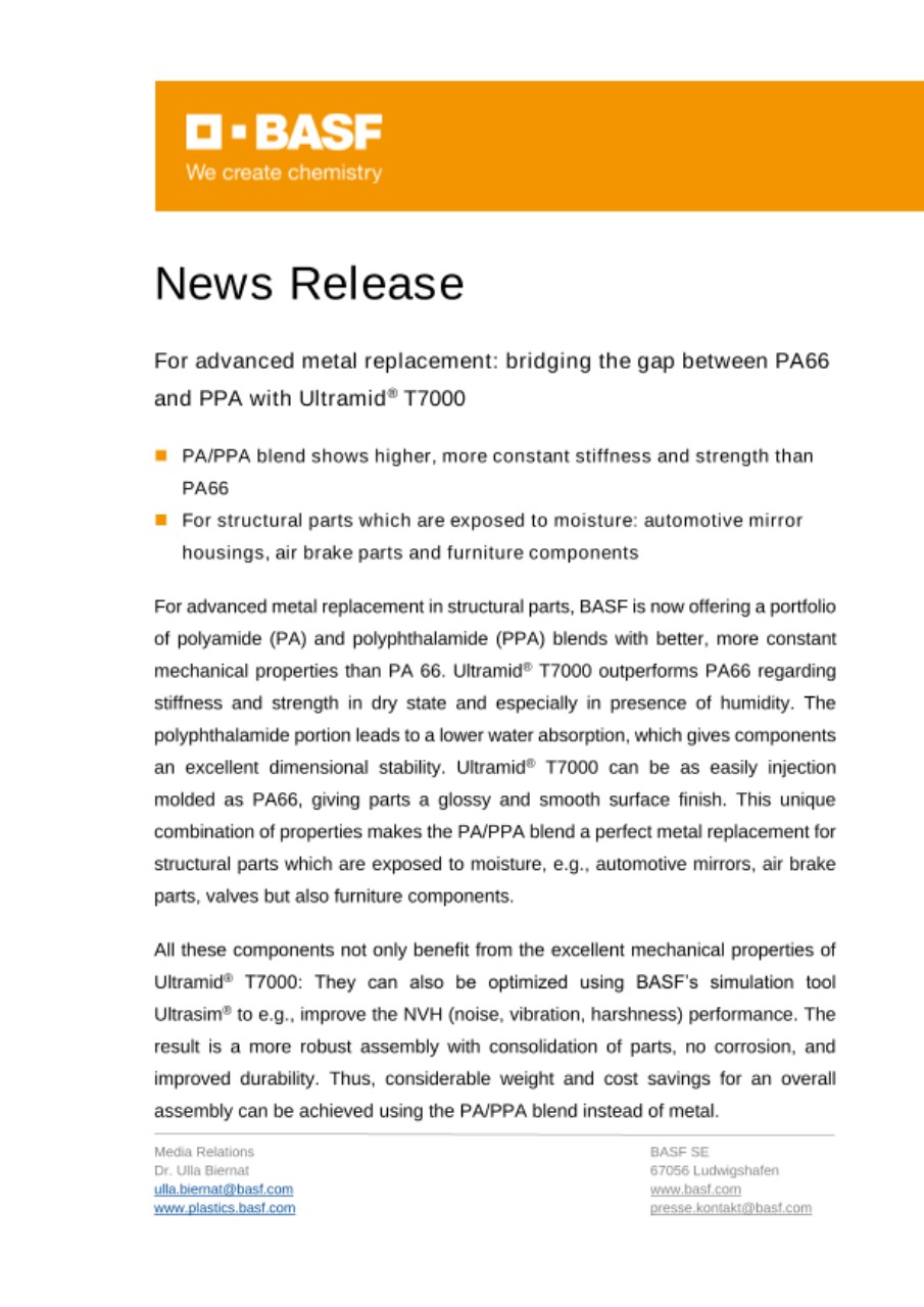 For advanced metal replacement: bridging the gap between PA66 and PPA with Ultramid® T7000