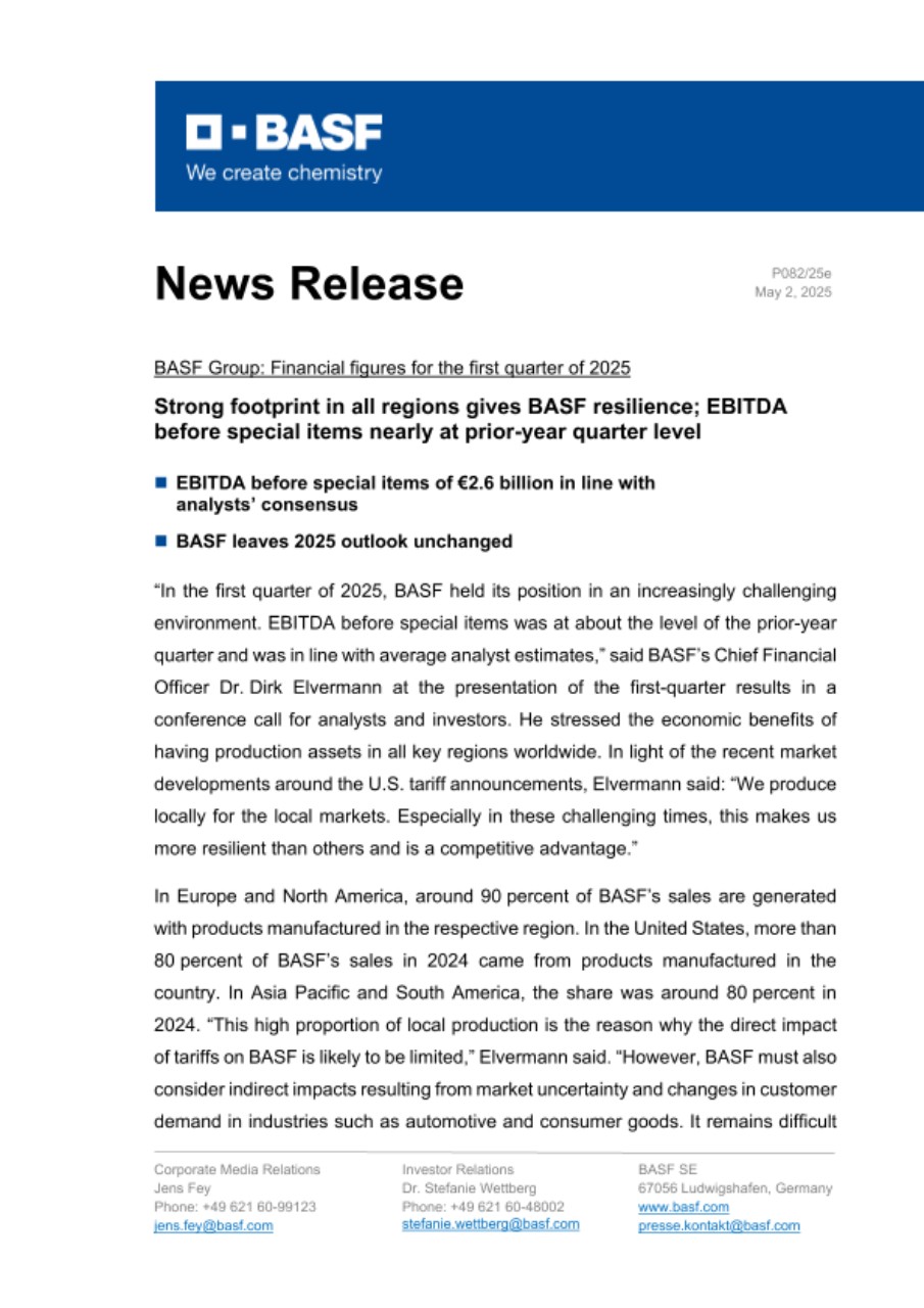 “In the first quarter of 2025, BASF held its position in an increasingly challenging environment. EBITDA before special items was at about the level of the prior-year quarter and was in line with average analyst estimates,” said BASF’s Chief Financial Officer Dr. Dirk Elvermann at the presentation of the first-quarter results in a conference call for analysts and investors. He stressed the economic benefits of having production assets in all key regions worldwide. In light of the recent market developments around the U.S. tariff announcements, Elvermann said: “We produce locally for the local markets. Especially in these challenging times, this makes us more resilient than others and is a competitive advantage.”