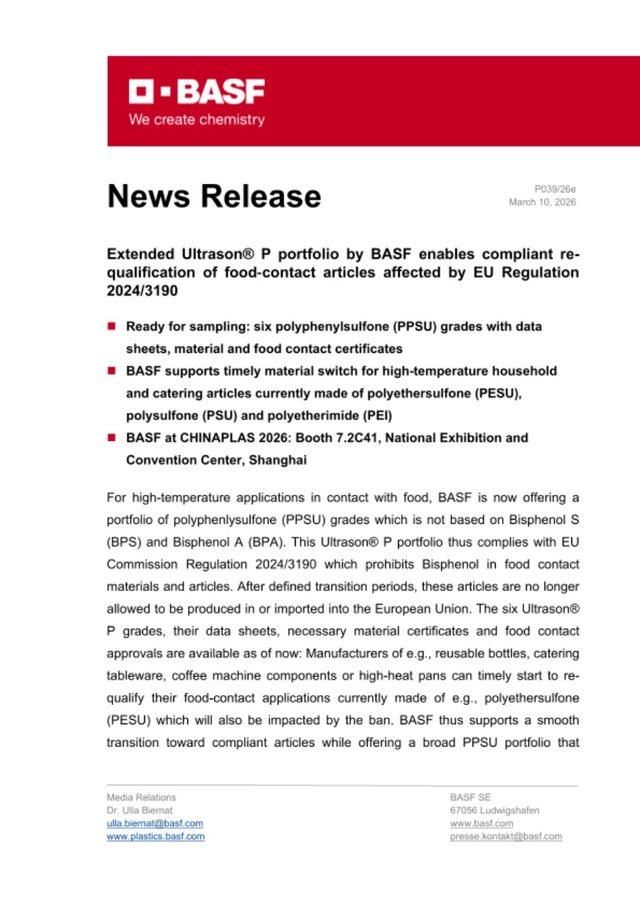 For high-temperature applications in contact with food, BASF is now offering a portfolio of polyphenlysulfone (PPSU) grades which is not based on Bisphenol S (BPS) and Bisphenol A (BPA). This Ultrason® P portfolio thus complies with EU Commission Regulation 2024/3190 which prohibits Bisphenol in food contact materials and articles. After defined transition periods, these articles are no longer allowed to be produced in or imported into the European Union. The six Ultrason® P grades, their data sheets, necessary material certificates and food contact approvals are available as of now: Manufacturers of e.g., reusable bottles, catering tableware, coffee machine components or high-heat pans can timely start to re-qualify their food-contact applications currently made of e.g., polyethersulfone (PESU) which will also be impacted by the ban. BASF thus supports a smooth transition toward compliant articles while offering a broad PPSU portfolio that enables food-contact parts with excellent processing, great design freedom and long-term performance.