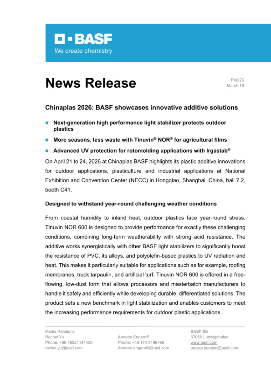 On April 21 to 24, 2026 at Chinaplas BASF highlights its plastic additive innovations for outdoor applications, plasticulture and industrial applications at National Exhibition and Convention Center (NECC) in Hongqiao, Shanghai, China, hall 7.2, booth C41.