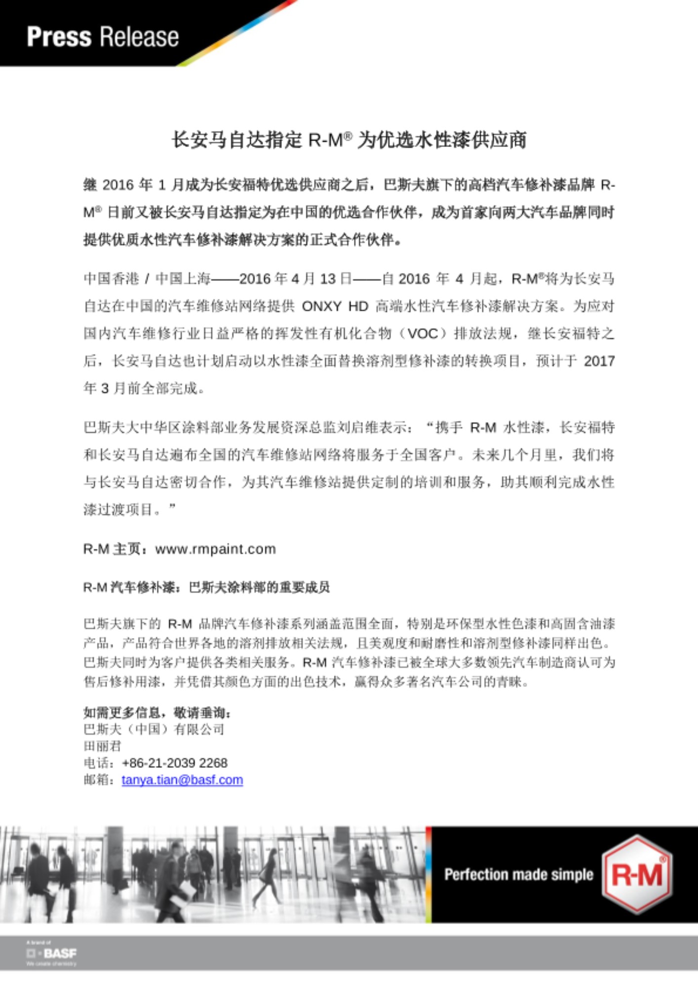 继 2016 年 1 月成为长安福特优选供应商之后,巴斯夫旗下的高档汽车修补漆品牌 R-M® 日前又被长安马自达指定为在中国的优选合作伙伴,成为首家向两大汽车品牌同时提供优质水性汽车修补漆解决方案的正式合作伙伴。