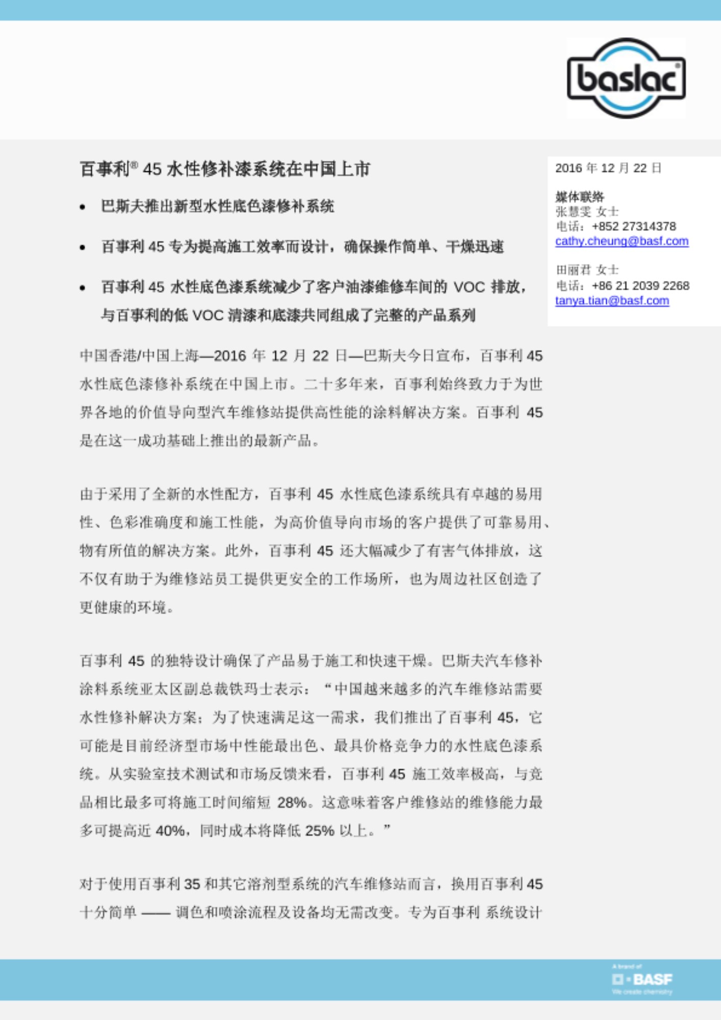 中国香港/中国上海—2016 年 12 月 22 日—巴斯夫今日宣布,百事利45 水性底色漆修补系统在中国上市。二十多年来,百事利始终致力于为世界各地的价值导向型汽车维修站提供高性能的涂料解决方案。百事利45 是在这一成功基础上推出的最新产品。