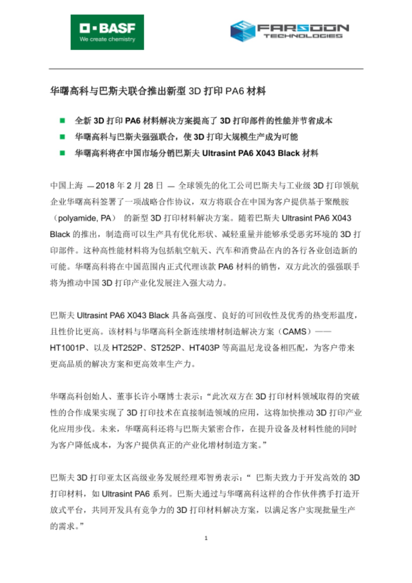 中国上海 — 2018年2月28日 — 全球领先的化工公司巴斯夫与工业级3D打印领航企业华曙高科签署了一项战略合作协议,双方将联合在中国为客户提供基于聚酰胺(polyamide, PA) 的新型3D打印材料解决方案。随着巴斯夫Ultrasint PA6 X043 Black的推出,制造商可以生产具有优化形状、减轻重量并能够承受恶劣环境的3D打印部件。这种高性能材料将为包括航空航天、汽车和消费品在内的各行各业创造新的可能。华曙高科将在中国范围内正式代理该款PA6材料的销售,双方此次的强强联手将为推动中国3D打印产业化发展注入强大动力。