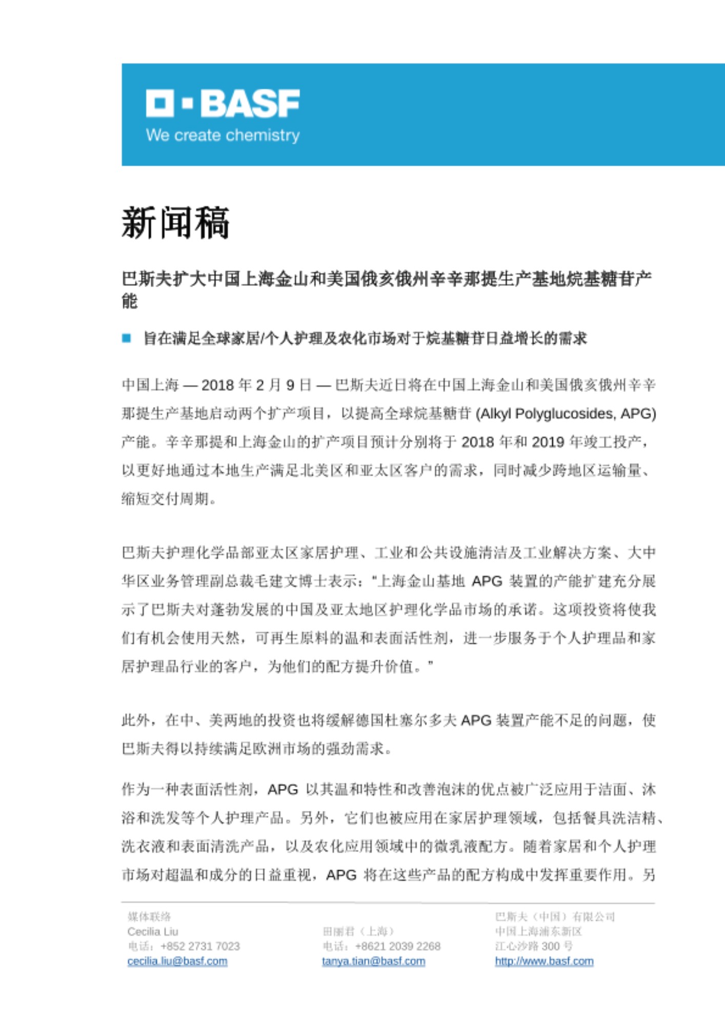 中国上海 — 2018 年 2 月 9 日 — 巴斯夫近日将在中国上海金山和美国俄亥俄州辛辛那提生产基地启动两个扩产项目,以提高全球烷基糖苷 (Alkyl Polyglucosides, APG) 产能。辛辛那提和上海金山的扩产项目预计分别将于 2018 年和 2019 年竣工投产,以更好地通过本地生产满足北美区和亚太区客户的需求,同时减少跨地区运输量、缩短交付周期。