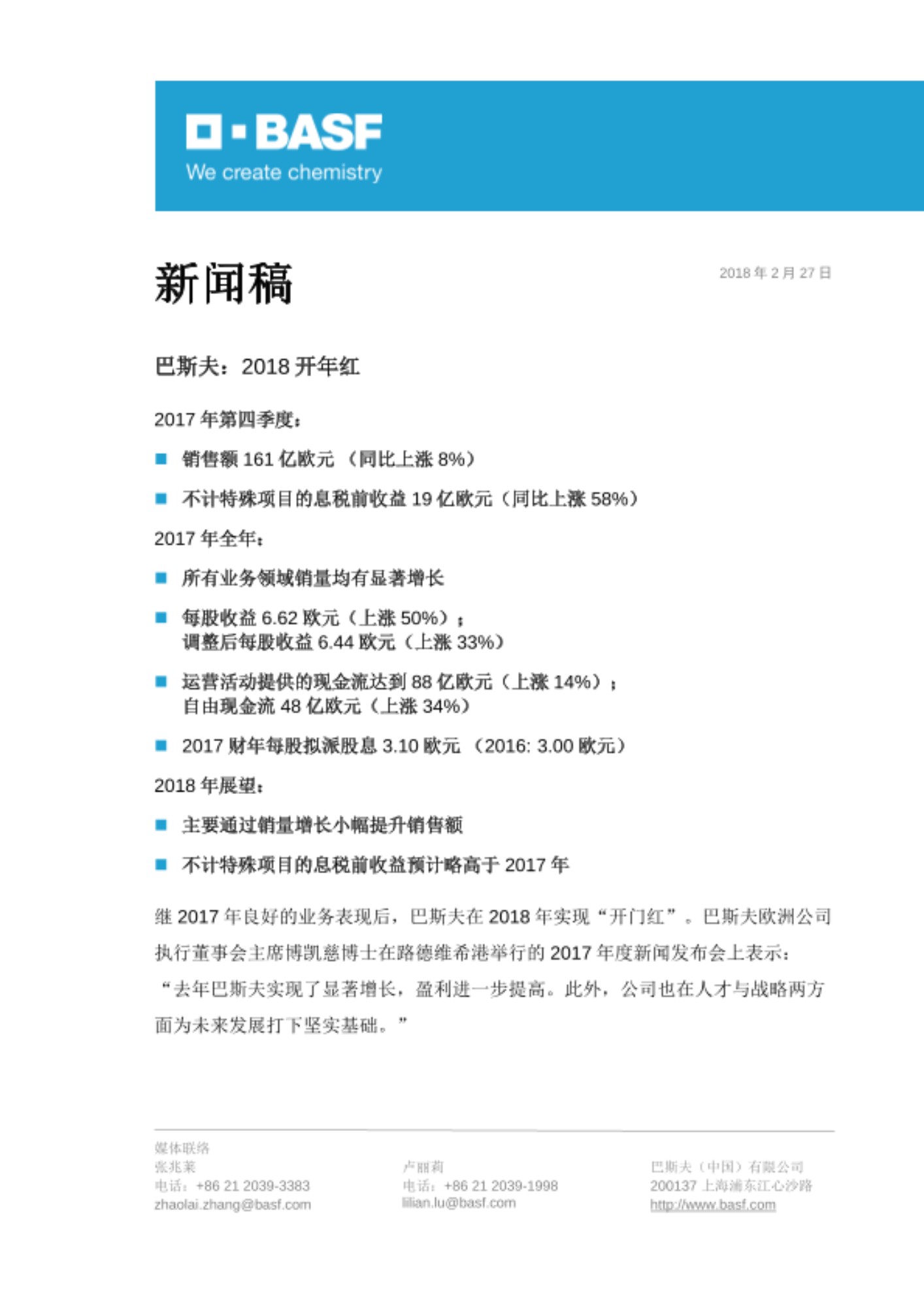 继2017年良好的业务表现后,巴斯夫在2018年实现“开门红”。巴斯夫欧洲公司执行董事会主席博凯慈博士在路德维希港举行的2017年度新闻发布会上表示:“去年巴斯夫实现了显著增长,盈利进一步提高。此外,公司也在人才与战略两方面为未来发展打下坚实基础。”
