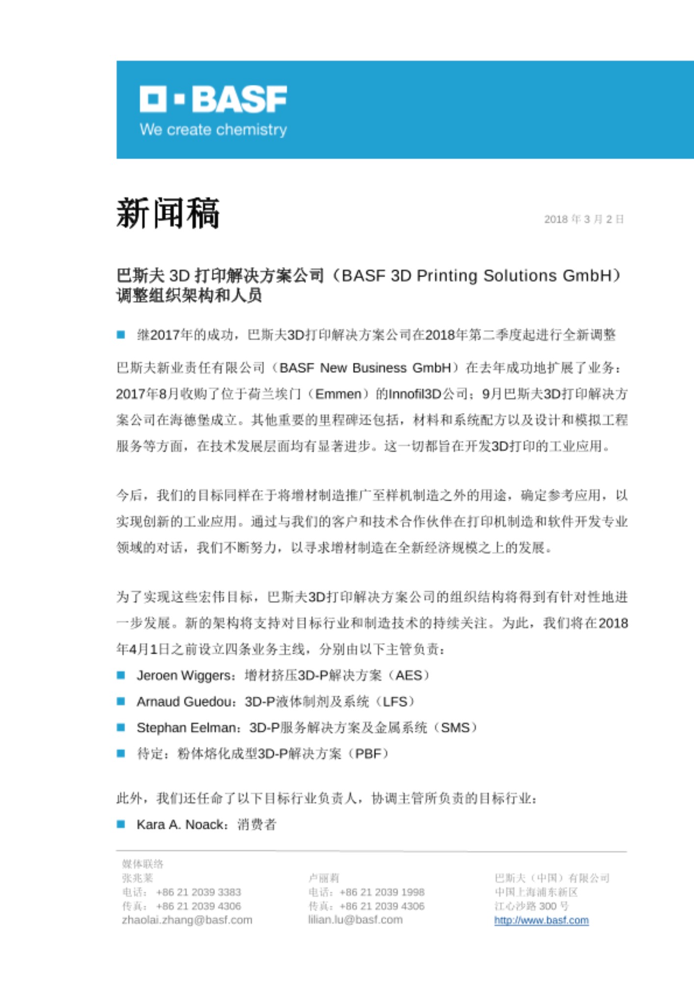 - 继2017年的成功,巴斯夫3D打印解决方案公司在2018年第二季度起进行全新调整