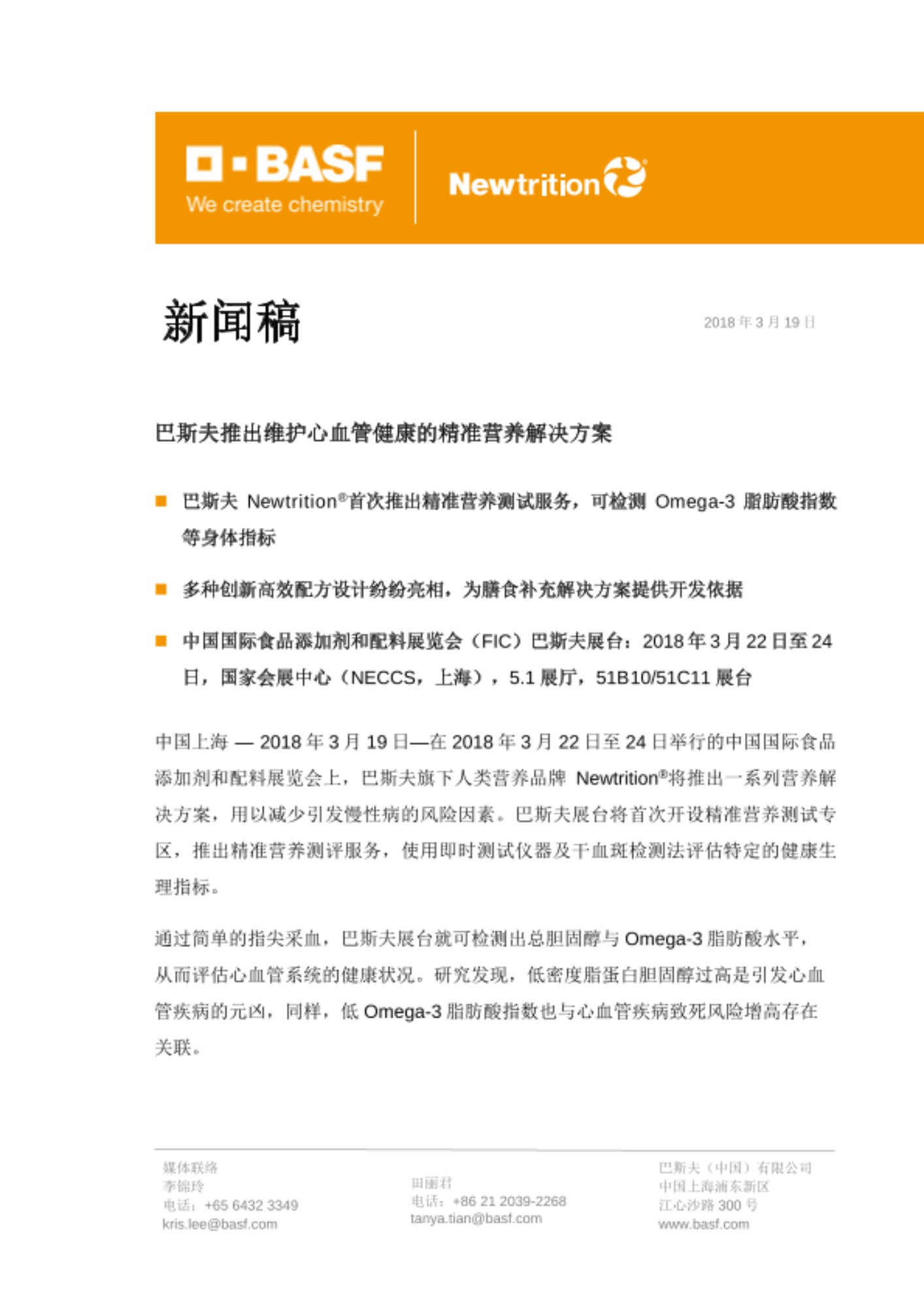 中国上海 — 2018年3月19日—在2018年3月22日至24日举行的中国国际食品添加剂和配料展览会上,巴斯夫旗下人类营养品牌Newtrition®将推出一系列营养解决方案,用以减少引发慢性病的风险因素。巴斯夫展台将首次开设精准营养测试专区,推出精准营养测评服务,使用即时测试仪器及干血斑检测法评估特定的健康生理指标。