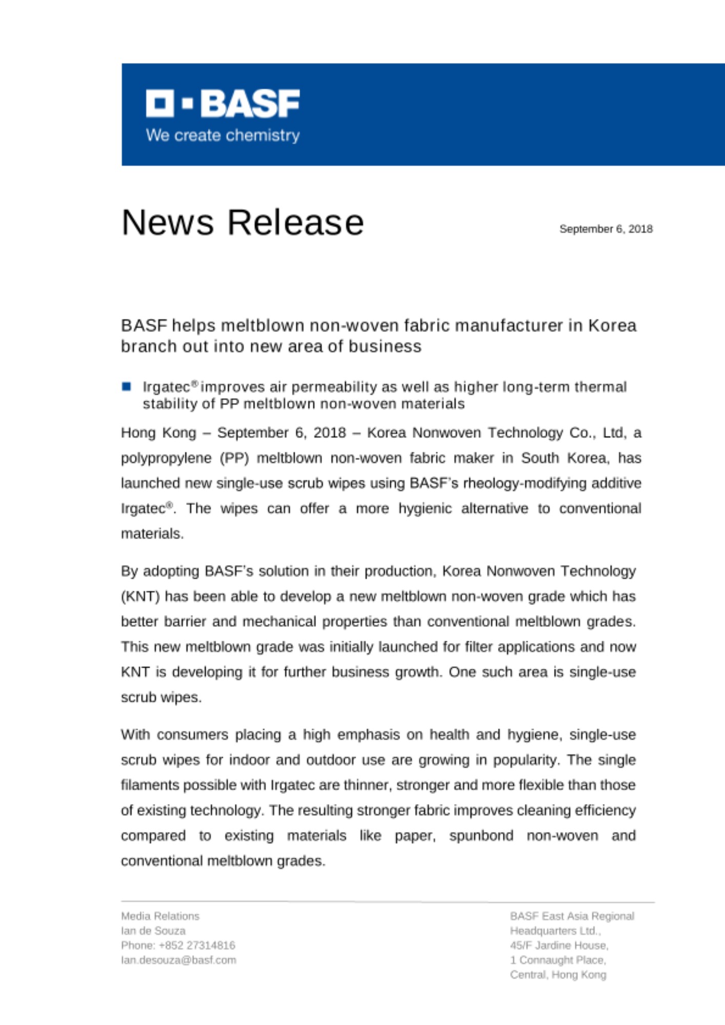 中国上海—2018年9月6日—韩国聚丙烯(PP)熔喷无纺布料制造商 -- 韩国无纺布技术有限公司推出采用巴斯夫流变改性剂Irgatec®生产的新款一次性擦洗抹布。该款抹布可以提供比传统材料更加卫生的替代品。