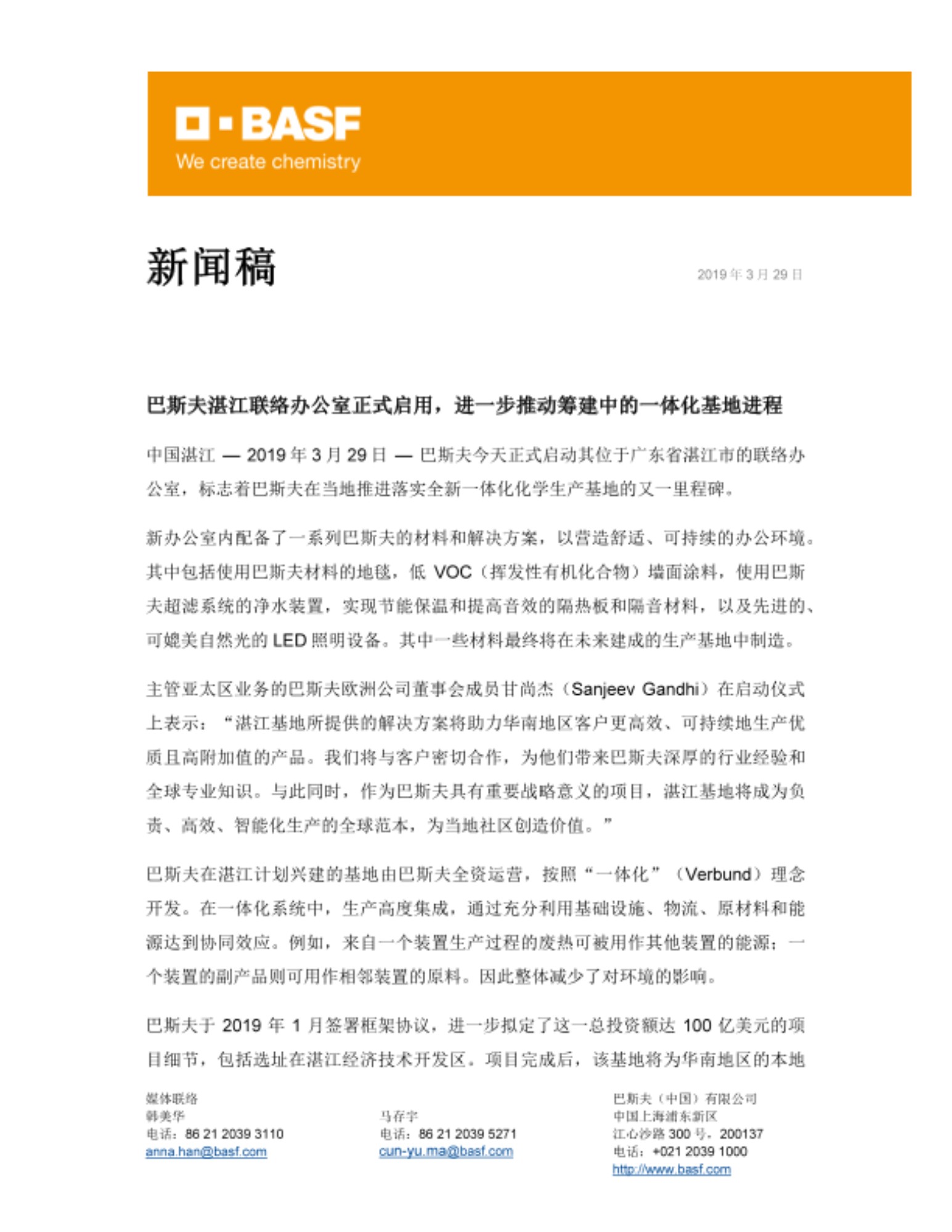 巴斯夫于2019年1月签署框架协议,进一步拟定了这一总投资额达100亿美元的项目细节,包括选址在湛江经济技术开发区。项目完成后,该基地将为华南地区的本地及跨国制造商提供面向汽车、建筑、高铁、电子电气、食品包装、家庭和个人护理、航空航天和制药等行业的解决方案。