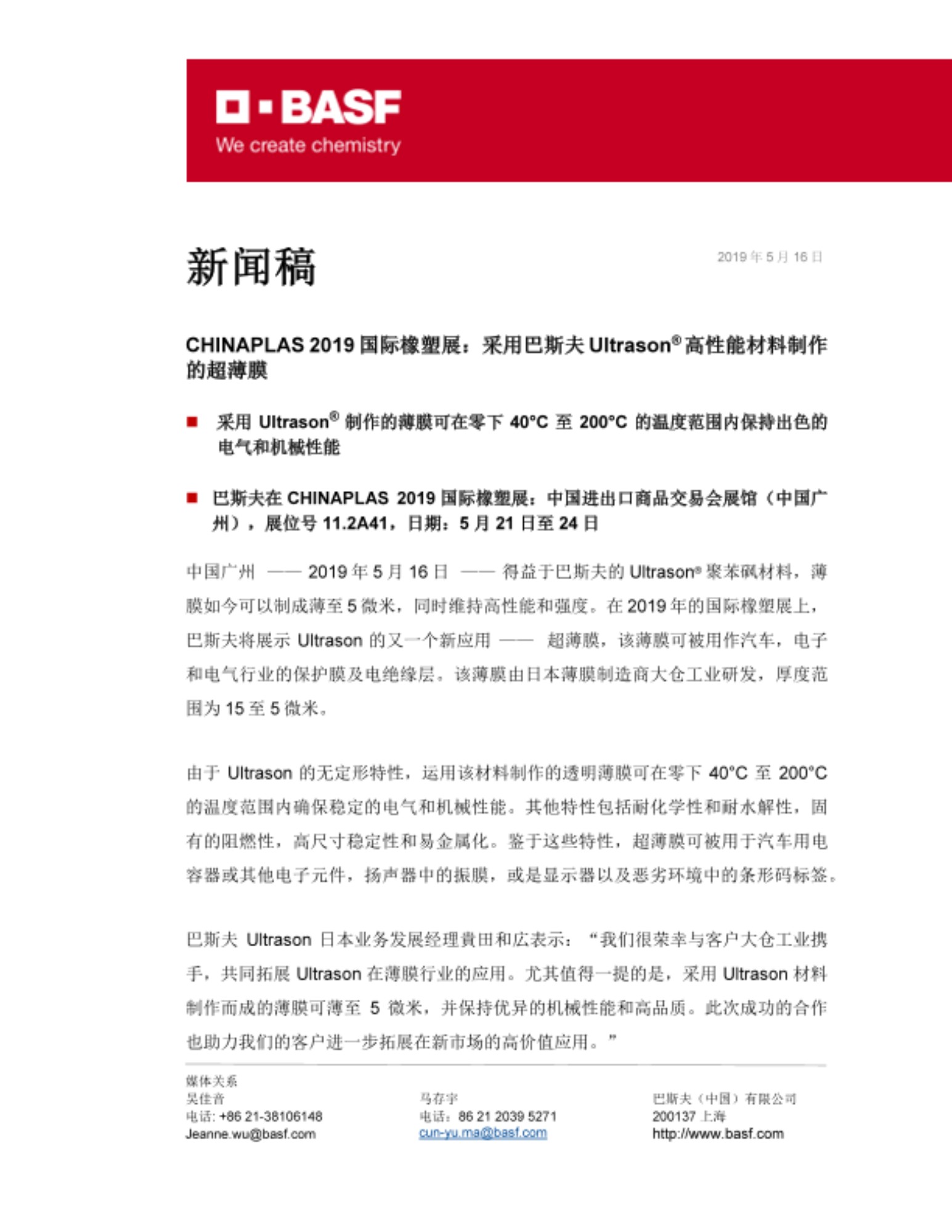有关巴斯夫在CHINAPLAS2019国际橡塑展上展品的更多信息,请访问https://chinaplas-basf.com 以及 www.ultrason.basf.com.