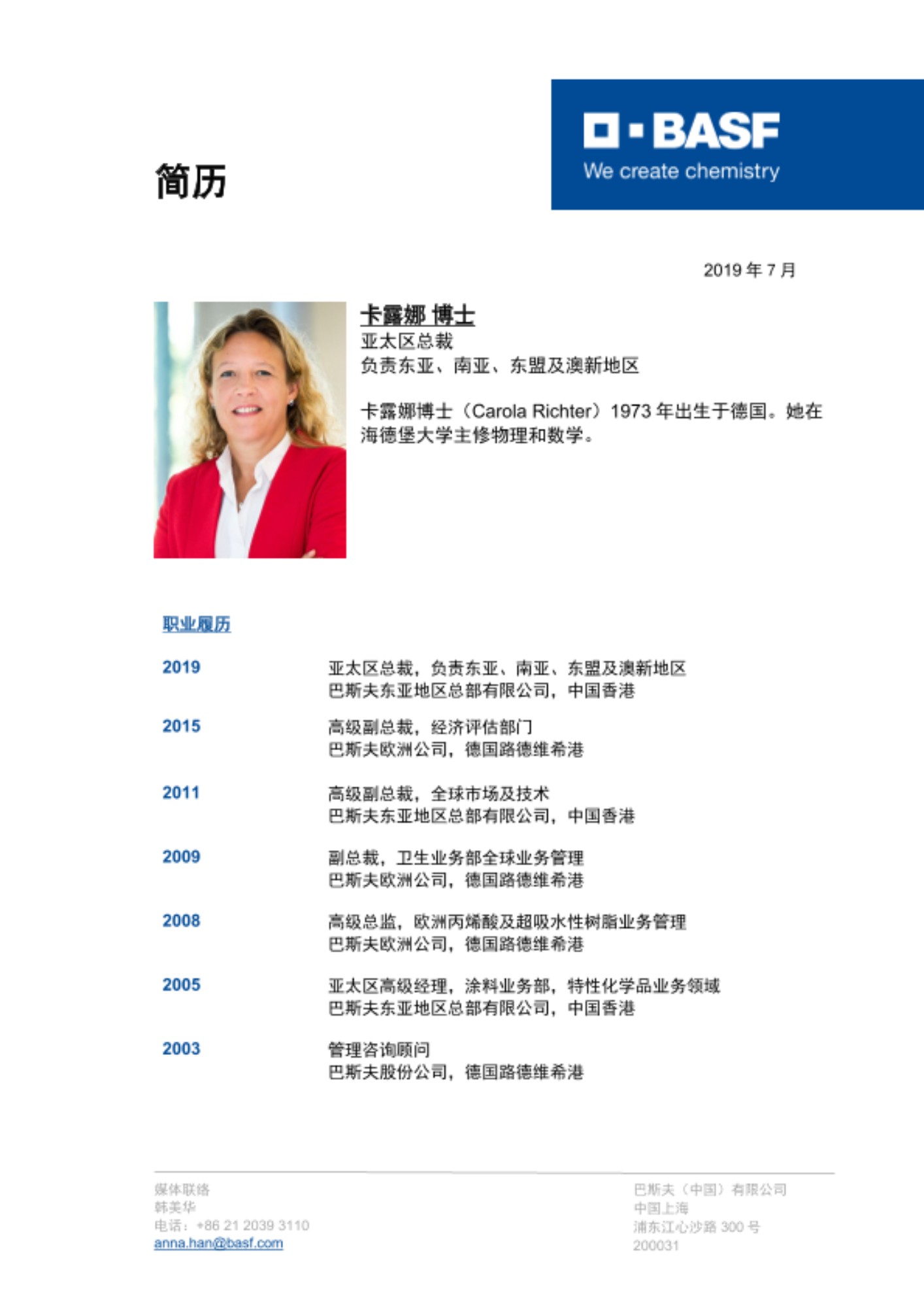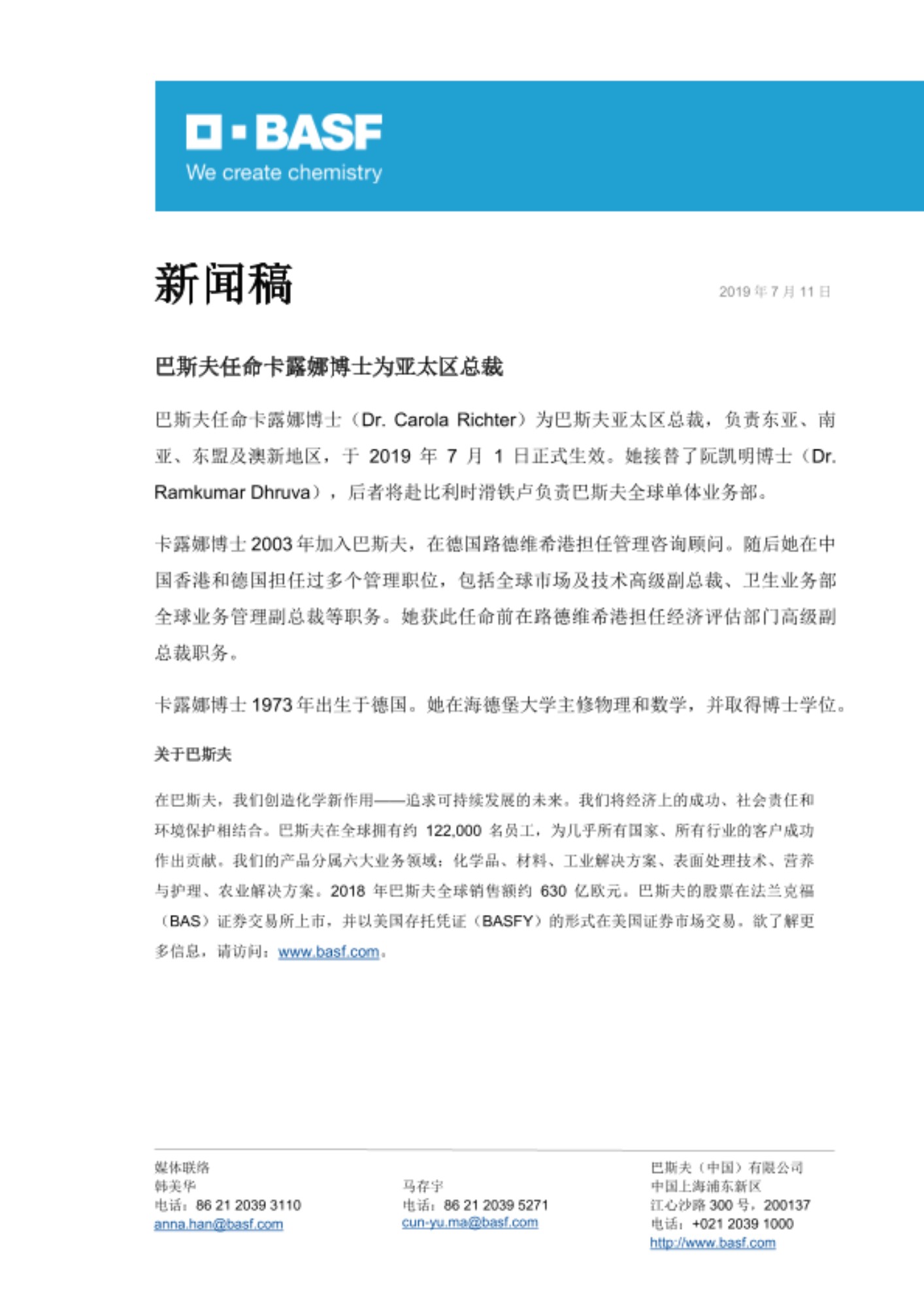 巴斯夫任命卡露娜博士(Dr. Carola Richter)为巴斯夫亚太区总裁,负责东亚、南亚、东盟及澳新地区,于2019年7月1日正式生效。她接替了阮凯明博士(Dr. Ramkumar Dhruva),后者将赴比利时滑铁卢负责巴斯夫全球单体业务部。