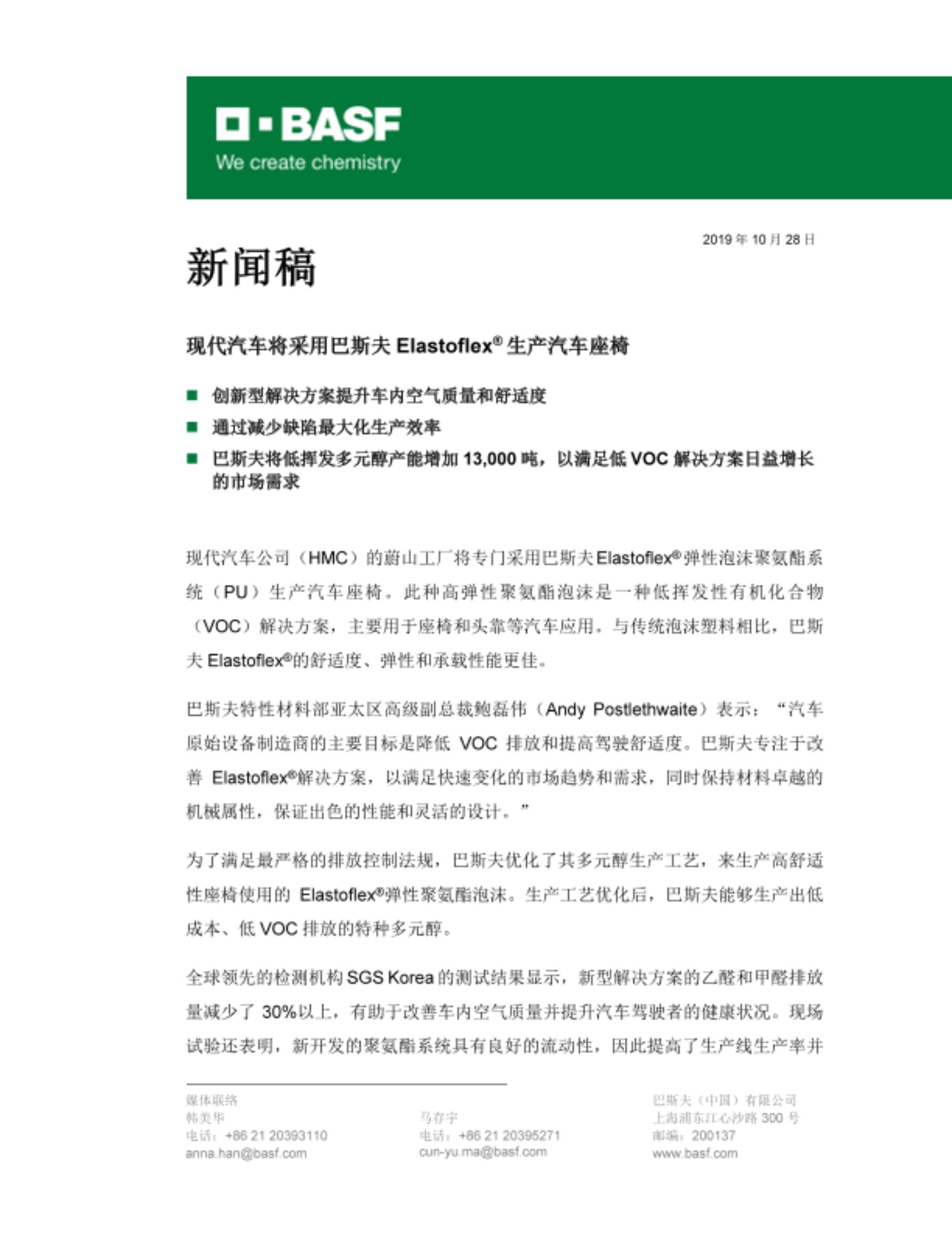 现代汽车公司(HMC)的蔚山工厂将专门采用巴斯夫Elastoflex® 弹性泡沫聚氨酯系统(PU)生产汽车座椅。此种高弹性聚氨酯泡沫是一种低挥发性有机化合物(VOC)解决方案,主要用于座椅和头靠等汽车应用。与传统泡沫塑料相比,巴斯夫Elastoflex®的舒适度、弹性和承载性能更佳。
