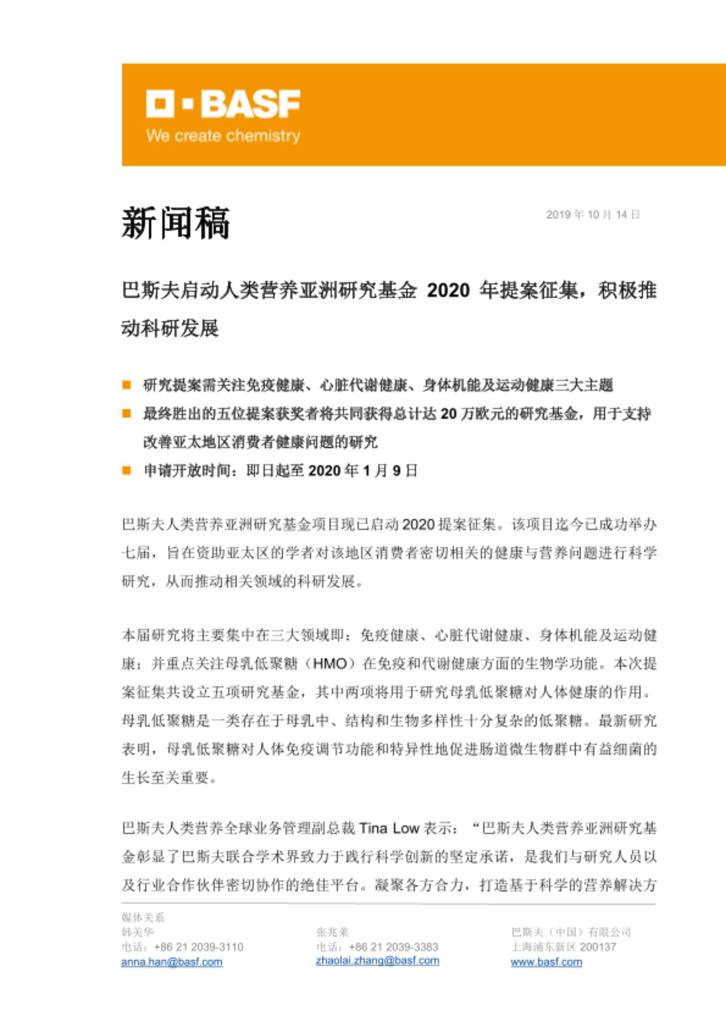有关项目指南、申请资质及其他相关信息,请浏览网页https://nutrition.basf.com/en/Human-nutrition/Cooperations.html或发送电子邮件至nutrition-research-grant@basf.com获取。