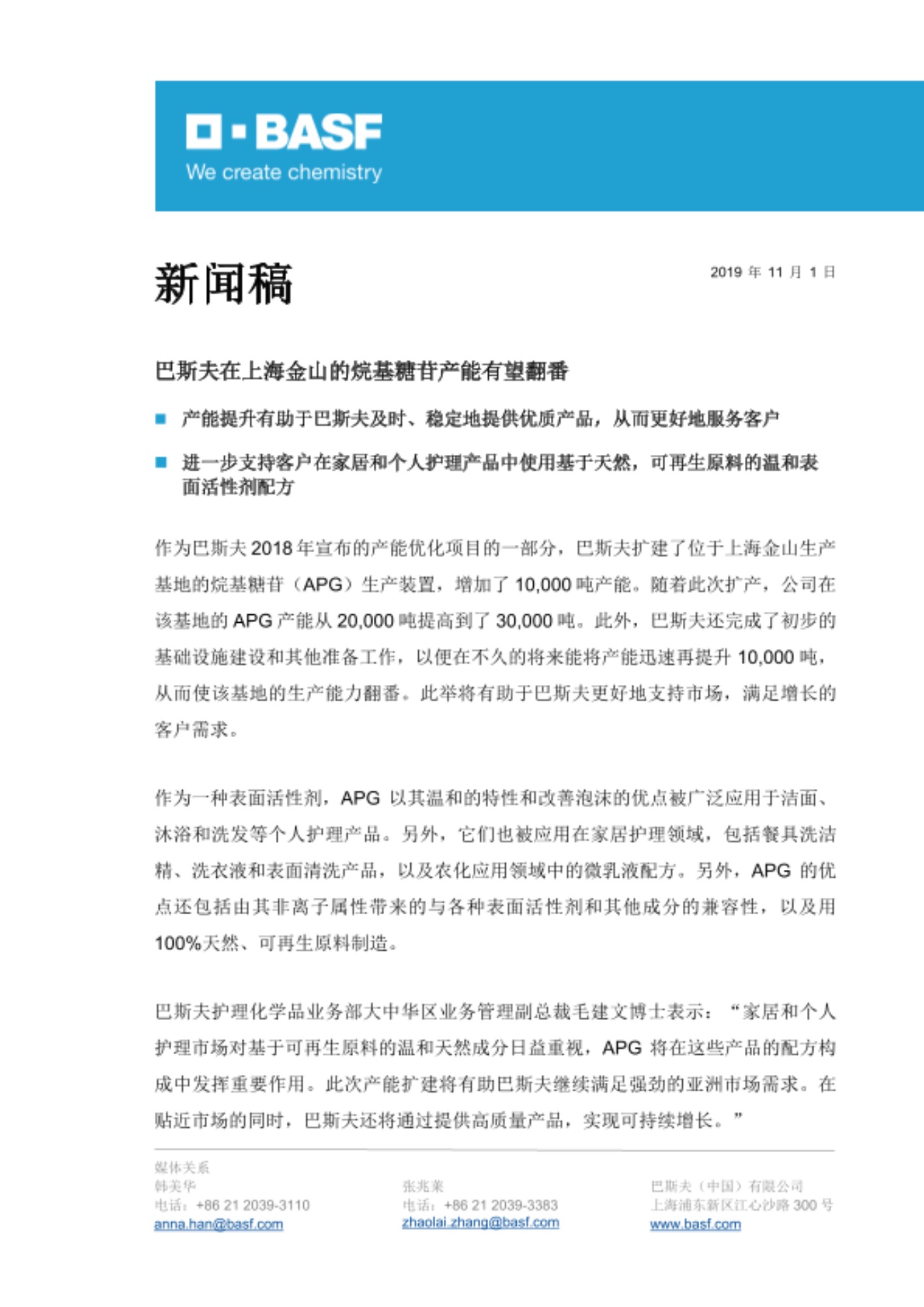 巴斯夫护理化学品业务部大中华区业务管理副总裁毛建文博士表示:“家居和个人护理市场对基于可再生原料的温和天然成分日益重视,APG 将在这些产品的配方构成中发挥重要作用。此次产能扩建将有助巴斯夫继续满足强劲的亚洲市场需求。在贴近市场的同时,巴斯夫还将通过提供高质量产品,实现可持续增长。”