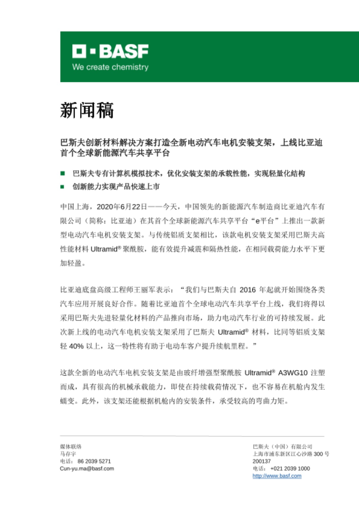 中国上海,2020年6月22日——今天,中国领先的新能源汽车制造商比亚迪汽车有限公司(简称:比亚迪)在其首个全球新能源汽车共享平台“e平台”上推出一款新型电动汽车电机安装支架。与传统铝质支架相比,该款电机安装支架采用巴斯夫高性能材料 Ultramid® 聚酰胺,能有效提升减震和隔热性能,在相同载荷能力水平下更加轻盈。