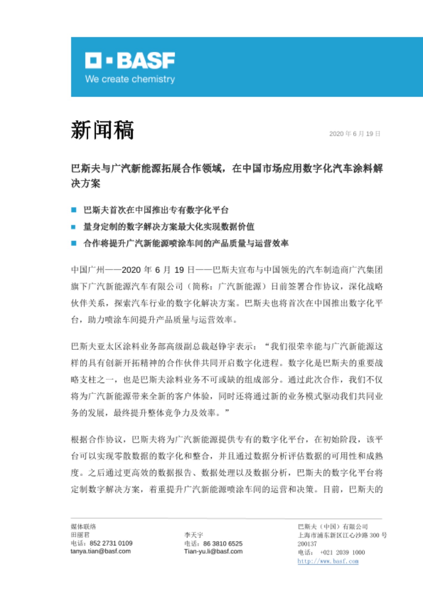 巴斯夫与广汽新能源自合作开始,首先支持广汽新能源建立喷涂车间,并提供包括全面色彩开发、喷涂车间管理等在内的一系列技术支持,成为广汽新能源从电泳、中涂、色漆到清漆100%的涂料供应商。巴斯夫提供的产品组合还包括用于提高整体涂层工艺质量与效率的数字化解决方案,以应对汽车行业的数字化需求与挑战。