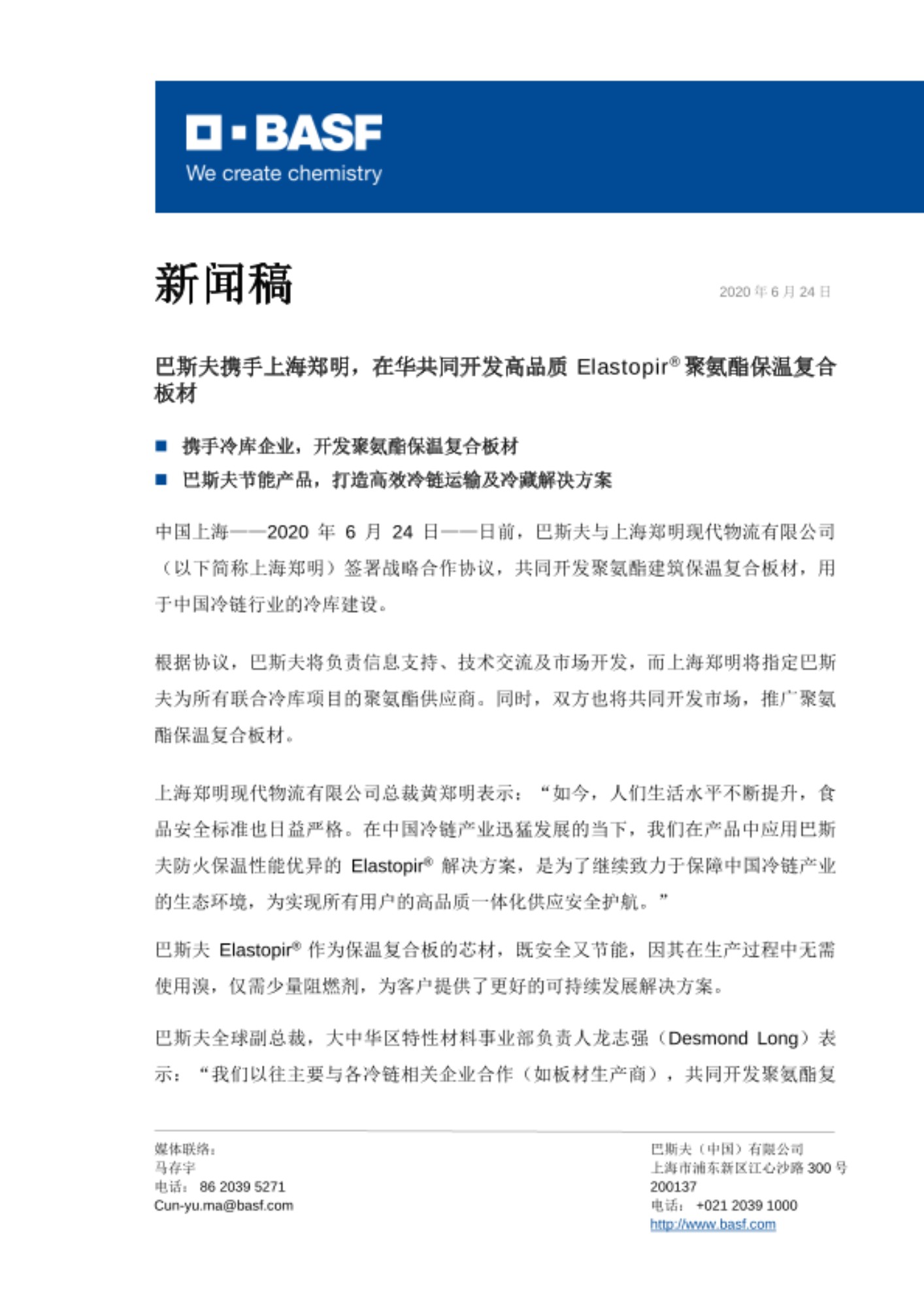 巴斯夫全球副总裁,大中华区特性材料事业部负责人龙志强(Desmond Long)表示:“我们以往主要与各冷链相关企业合作(如板材生产商),共同开发聚氨酯复合板材。这次直接与冷库公司合作是巴斯夫发展战略的重要里程碑。我们衷心感谢上海郑明提供这次振奋人心的合作机会,期待我们能共同助力中国冷链供应。”