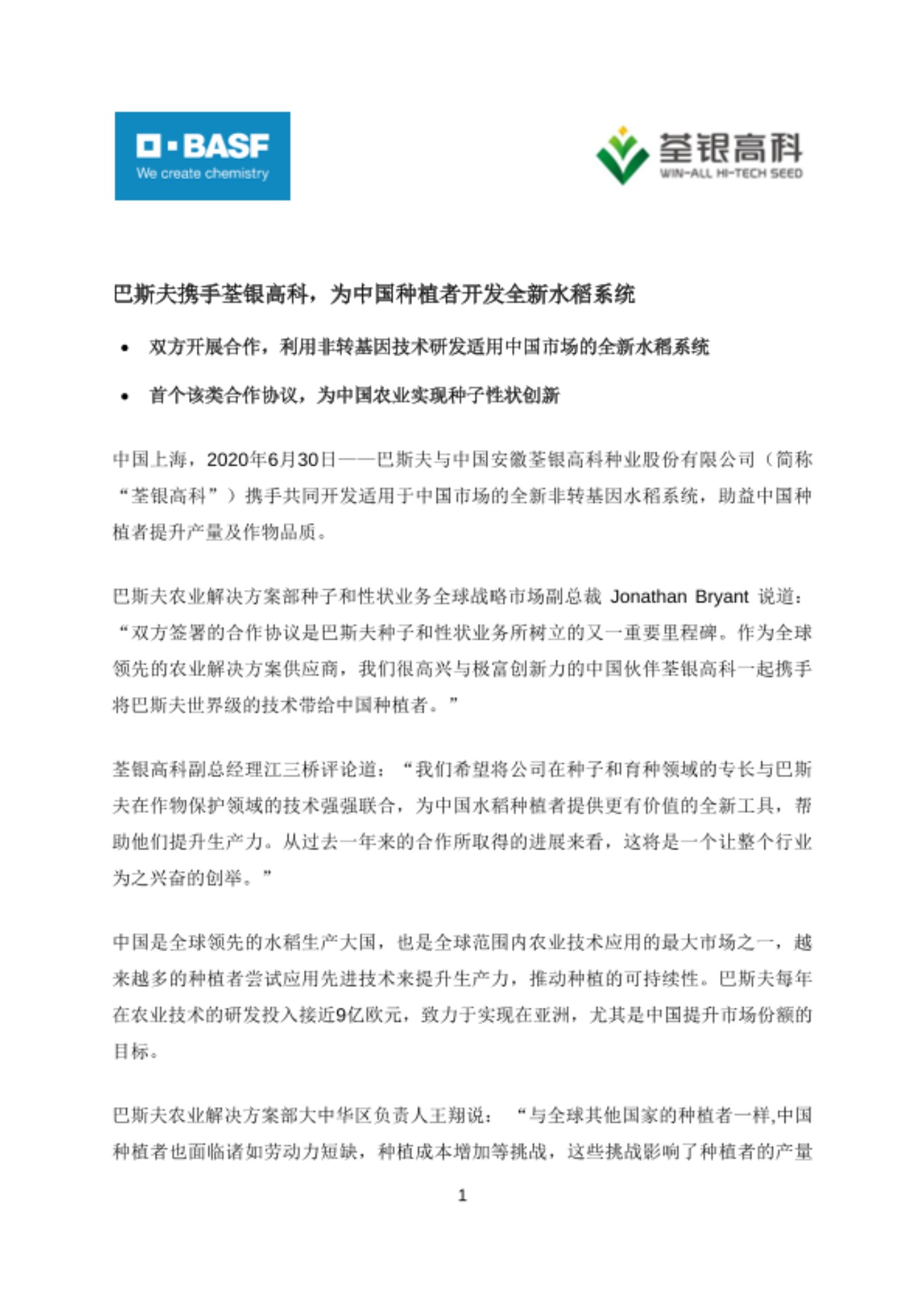 中国上海,2020年6月30日——巴斯夫与中国安徽荃银高科种业股份有限公司(简称“荃银高科”)携手共同开发适用于中国市场的全新非转基因水稻系统,助益中国种植者提升产量及作物品质。