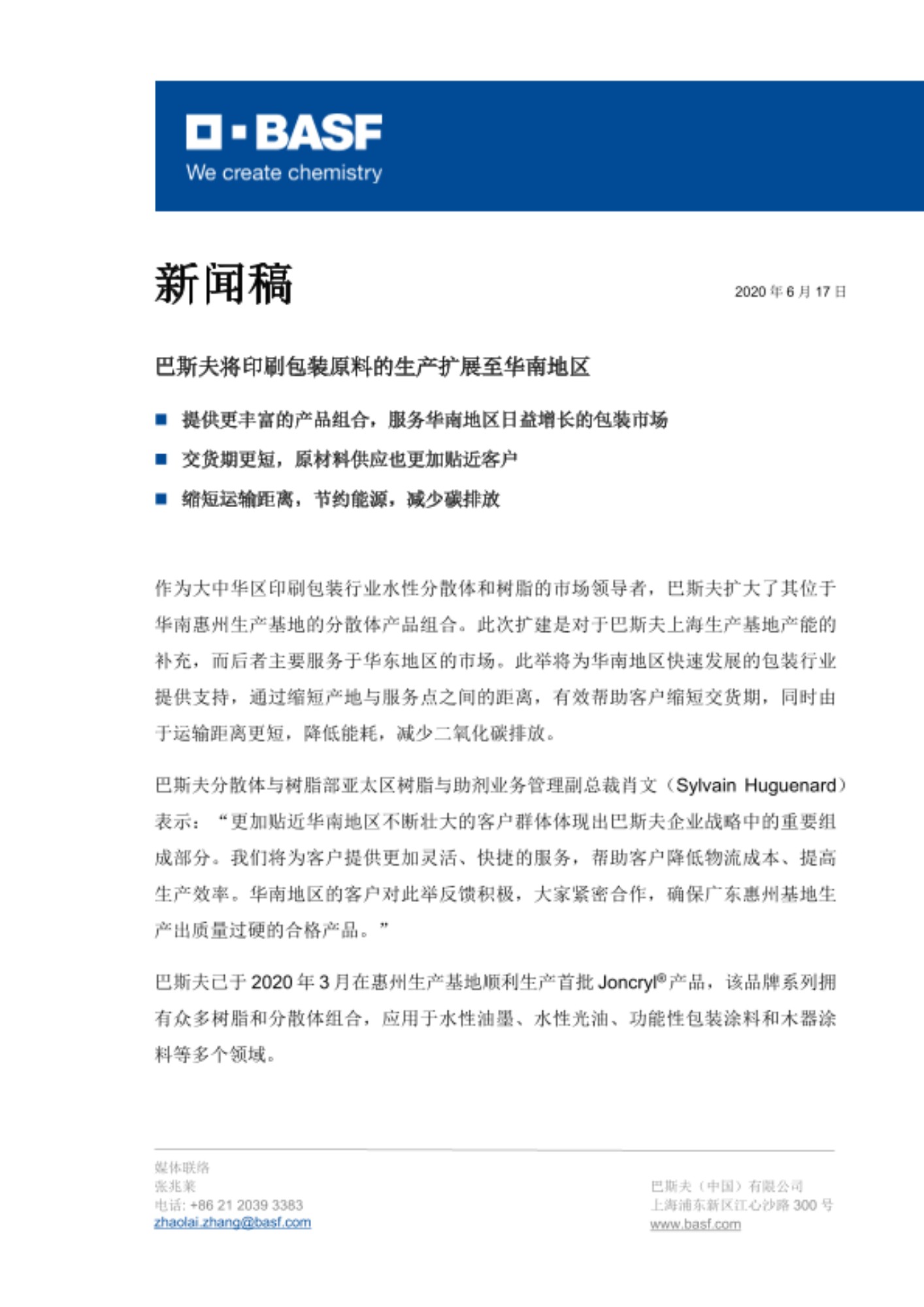 作为大中华区印刷包装行业水性分散体和树脂的市场领导者,巴斯夫扩大了其位于华南惠州生产基地的分散体产品组合。此次扩建是对于巴斯夫上海生产基地产能的补充,而后者主要服务于华东地区的市场。此举将为华南地区快速发展的包装行业提供支持,通过缩短产地与服务点之间的距离,有效帮助客户缩短交货期,同时由于运输距离更短,降低能耗,减少二氧化碳排放。