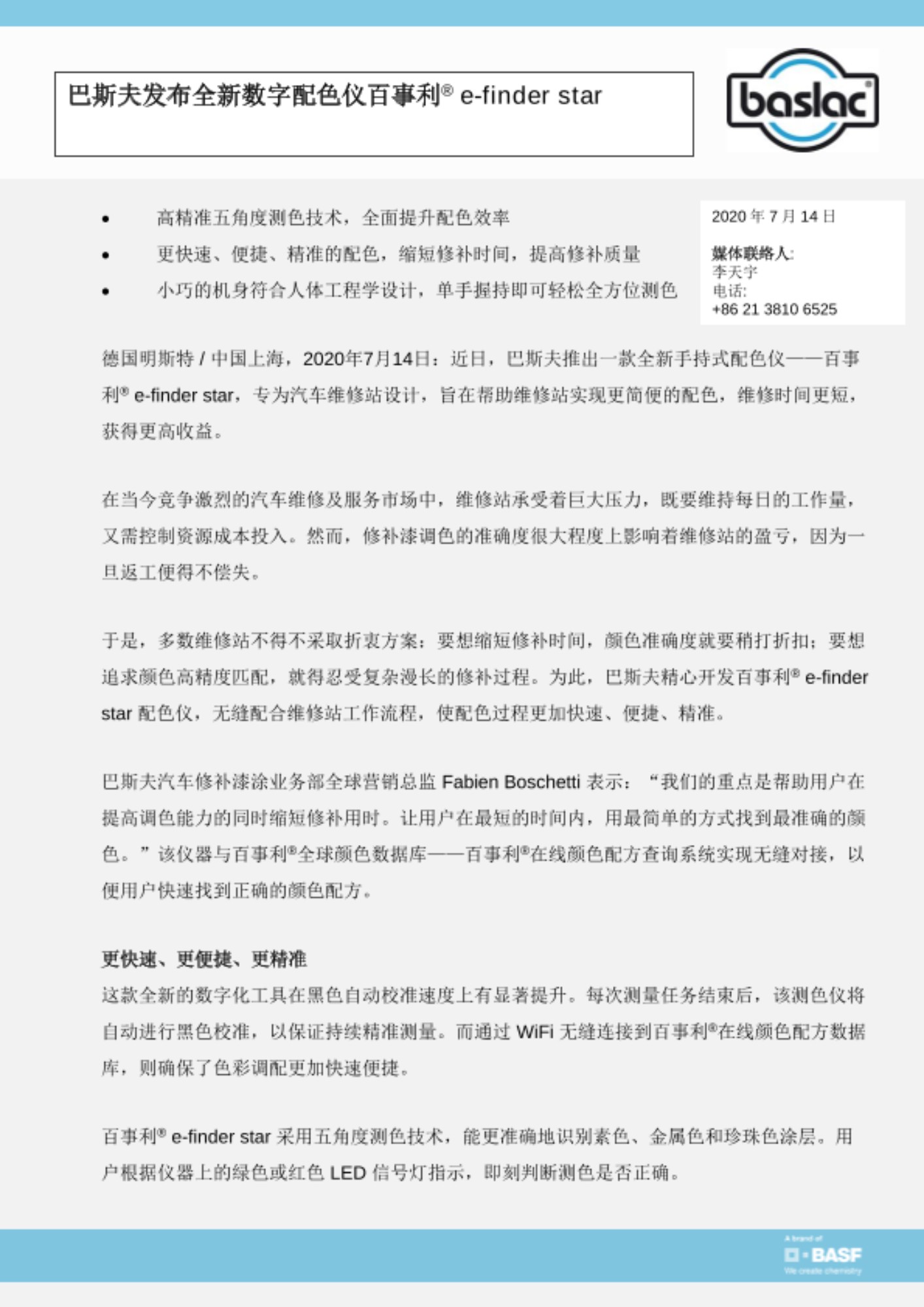 德国明斯特 / 中国上海,2020年7月14日:近日,巴斯夫推出一款全新手持式配色仪——百事利® e-finder star,专为汽车维修站设计,旨在帮助维修站实现更简便的配色,维修时间更短,获得更高收益。