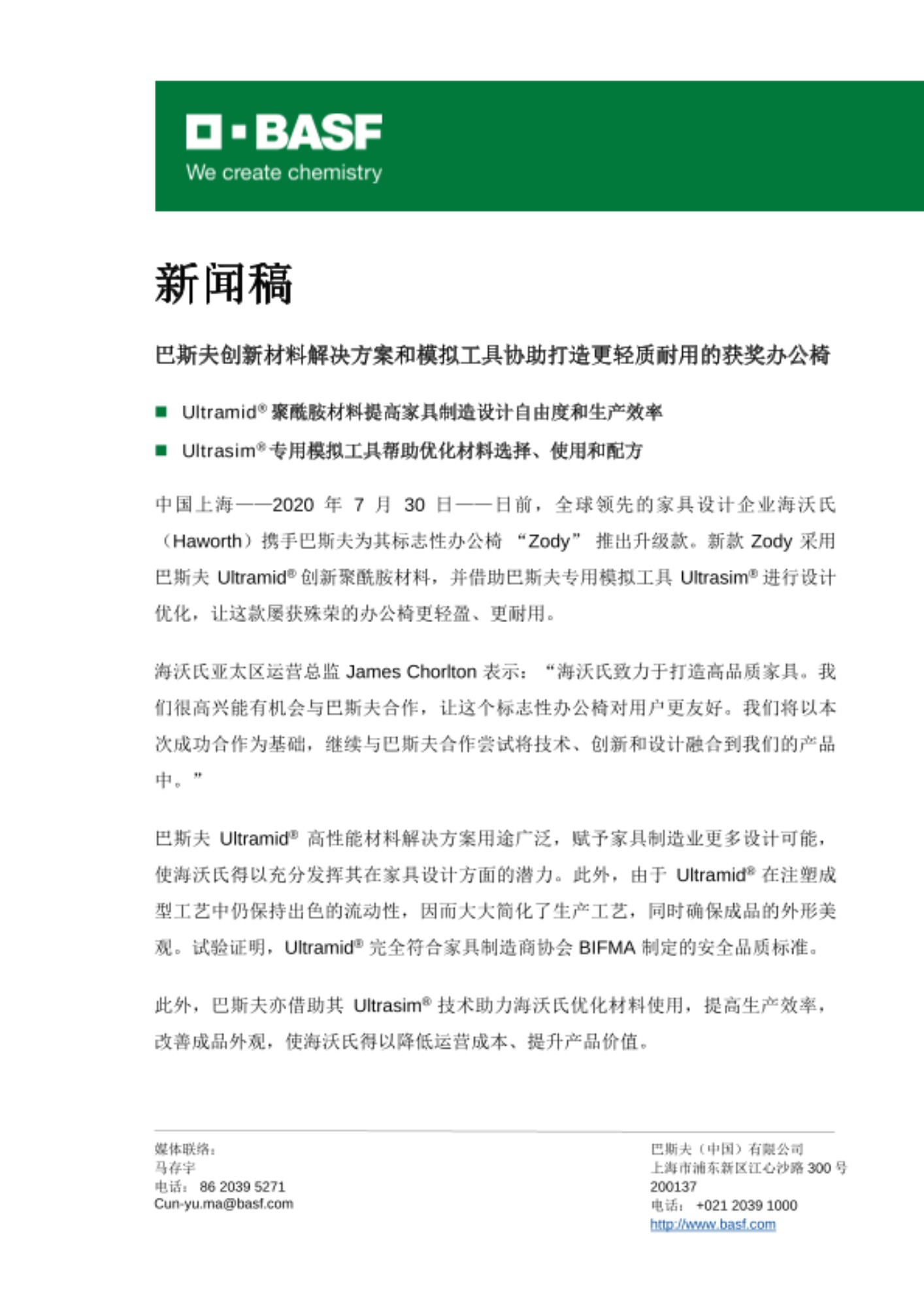 中国上海——2020 年 7 月 30 日——日前,全球领先的家具设计企业海沃氏(Haworth)携手巴斯夫为其标志性办公椅 “Zody” 推出升级款。新款 Zody 采用巴斯夫 Ultramid® 创新聚酰胺材料,并借助巴斯夫专用模拟工具 Ultrasim® 进行设计优化,让这款屡获殊荣的办公椅更轻盈、更耐用。