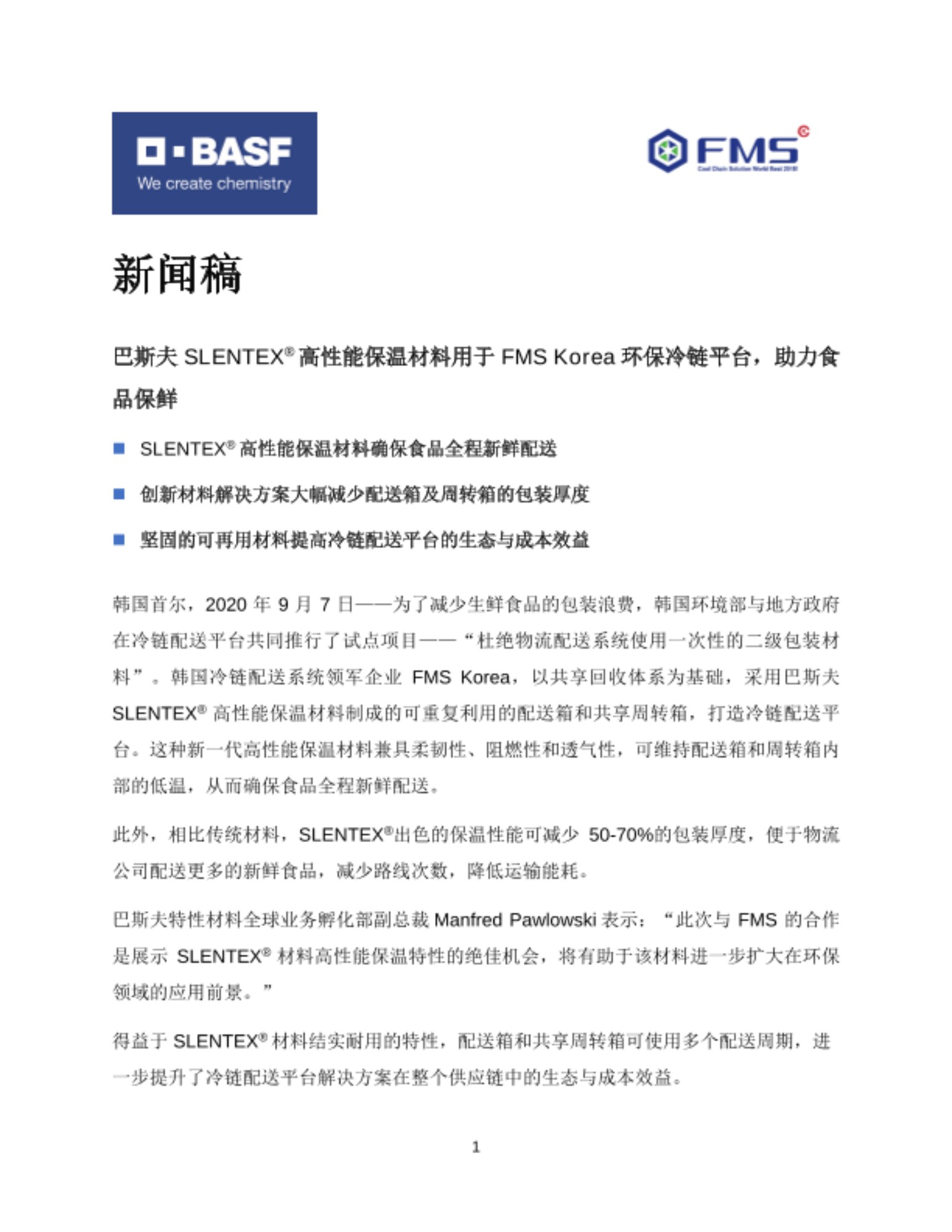 FMS Korea 首席执行官崔东镐表示:“在韩国,物流配送市场为了保护产品、保证新鲜,时常过度包装,造成大量浪费。我们的冷链配送平台采用了巴斯夫高性能 SLENTEX® 保温材料,将重复利用解决方案应用于高端冷藏车和冷库体系,帮助我们减少在包装及运输过程中造成的环境影响,同时降低运营成本。”