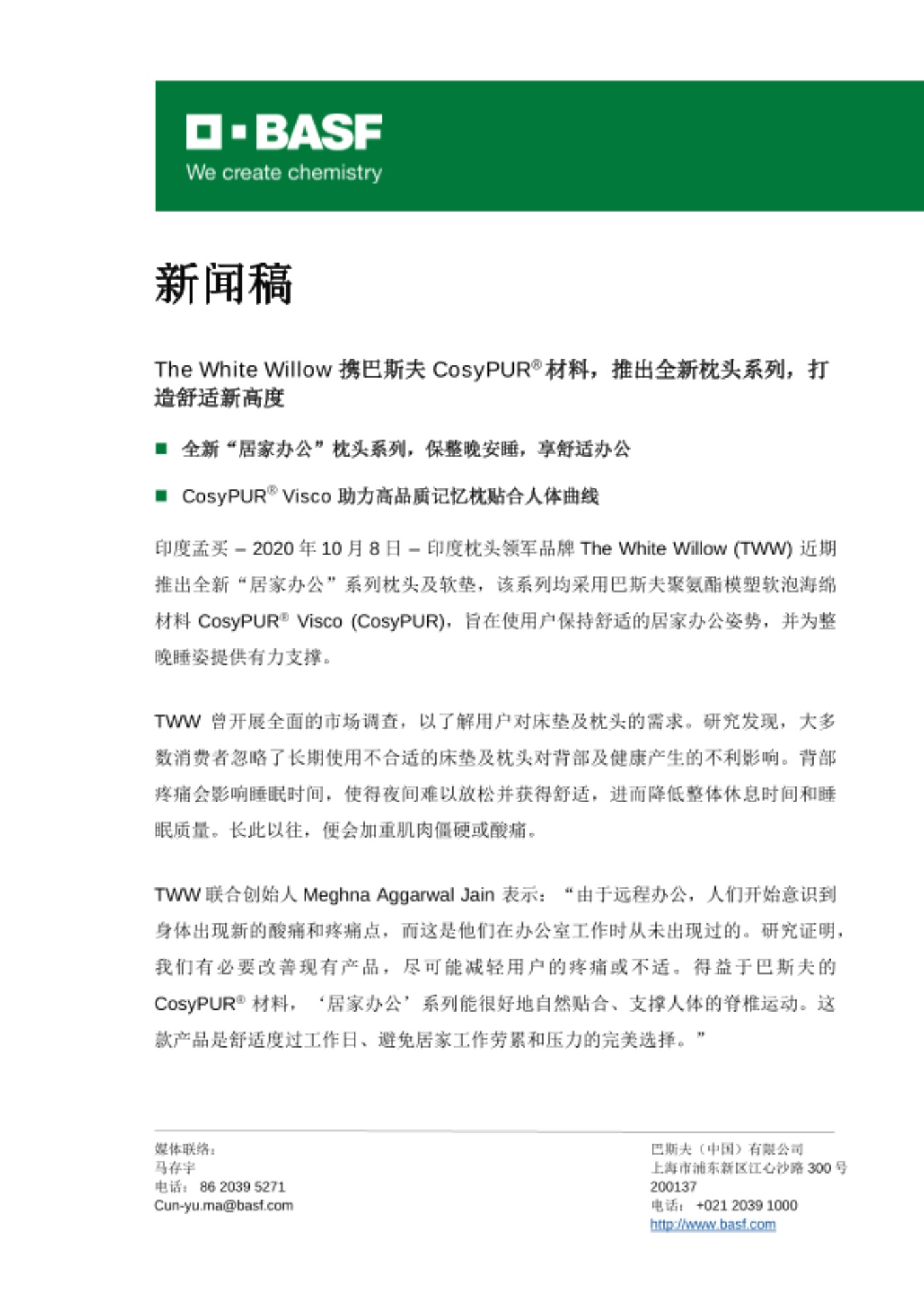 印度孟买 – 2020年10月8日 – 印度枕头领军品牌The White Willow (TWW) 近期推出全新“居家办公”系列枕头及软垫,该系列均采用巴斯夫聚氨酯模塑软泡海绵材料CosyPUR® Visco (CosyPUR),旨在使用户保持舒适的居家办公姿势,并为整晚睡姿提供有力支撑。
