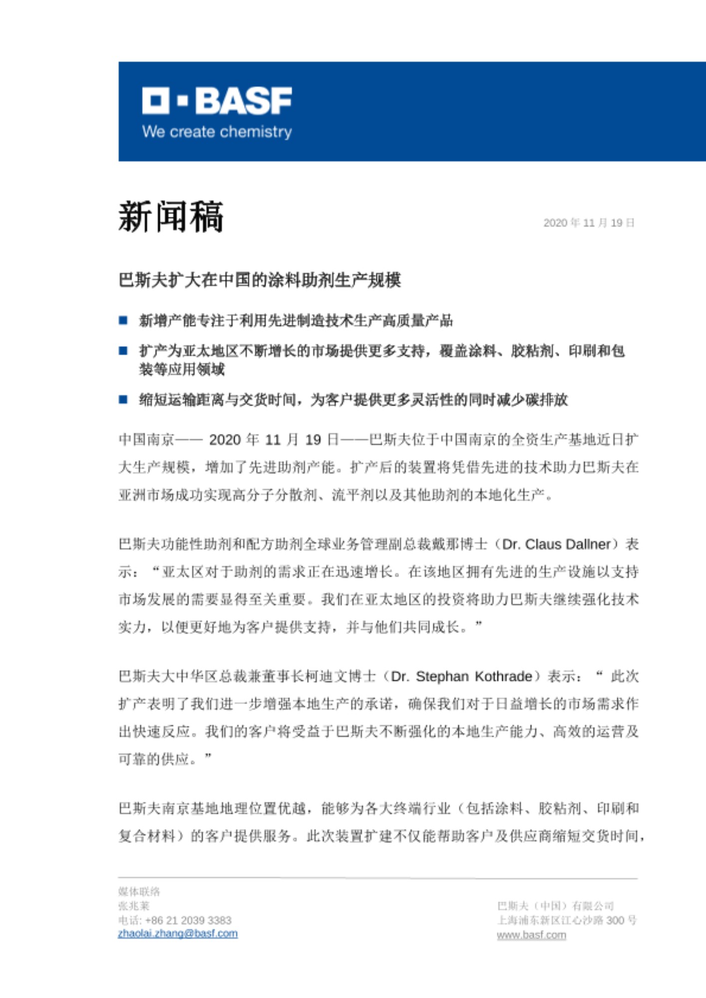 中国南京—— 2020年11月19日——巴斯夫位于中国南京的全资生产基地近日扩大生产规模,增加了先进助剂产能。扩产后的装置将凭借先进的技术助力巴斯夫在亚洲市场成功实现高分子分散剂、流平剂以及其他助剂的本地化生产。