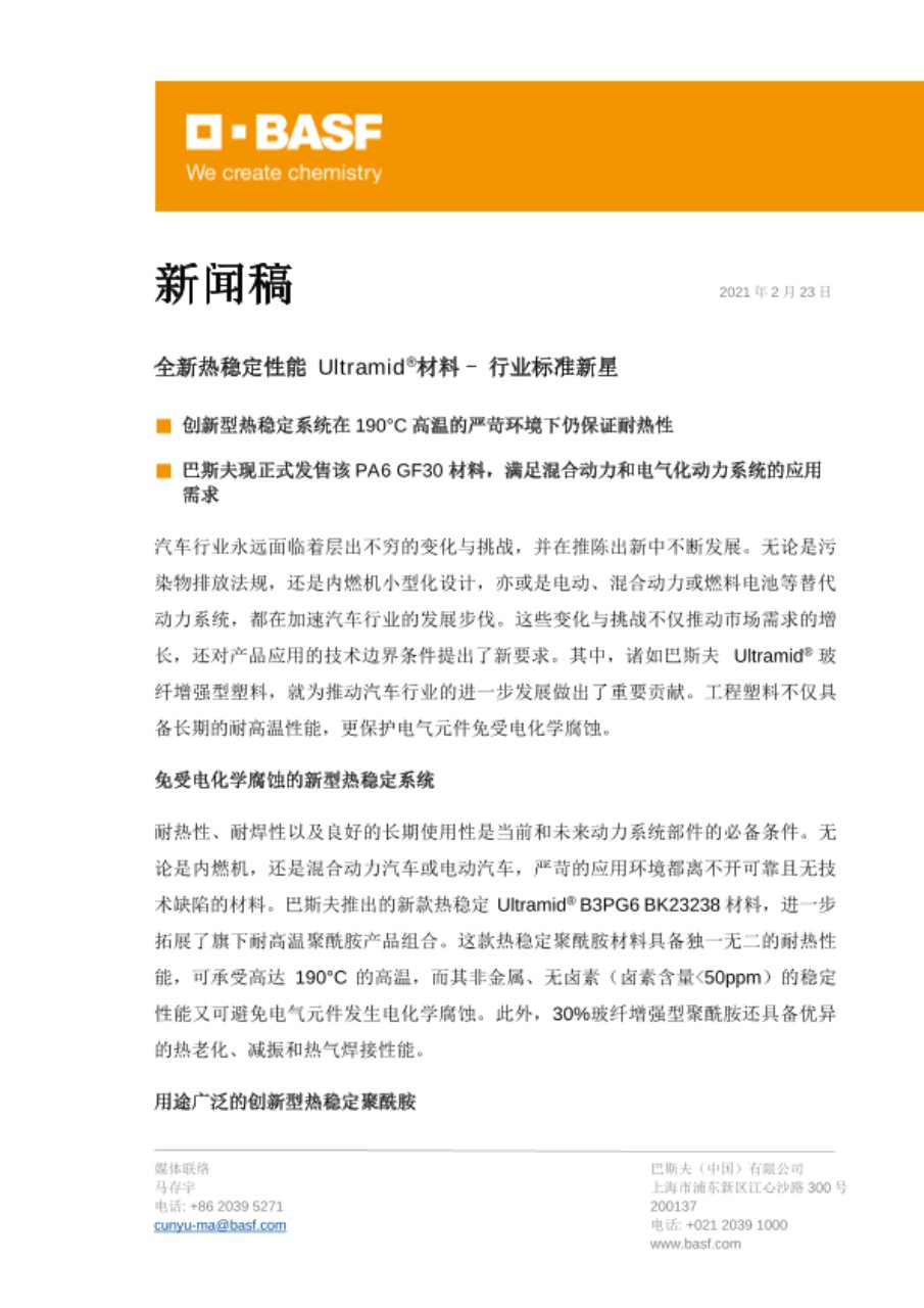 - 巴斯夫现正式发售该PA6 GF30 材料,满足混合动力和电气化动力系统的应用需求
